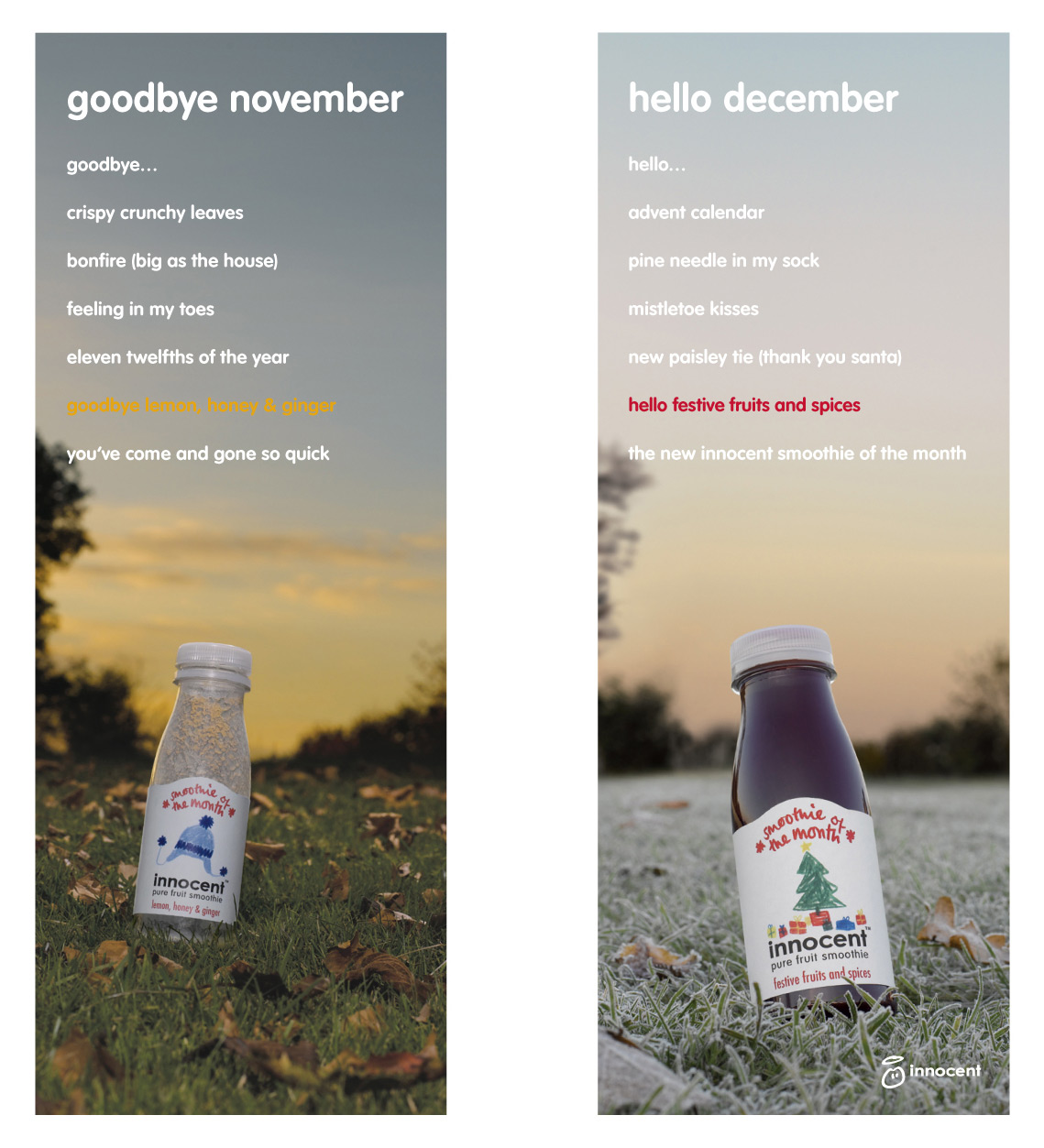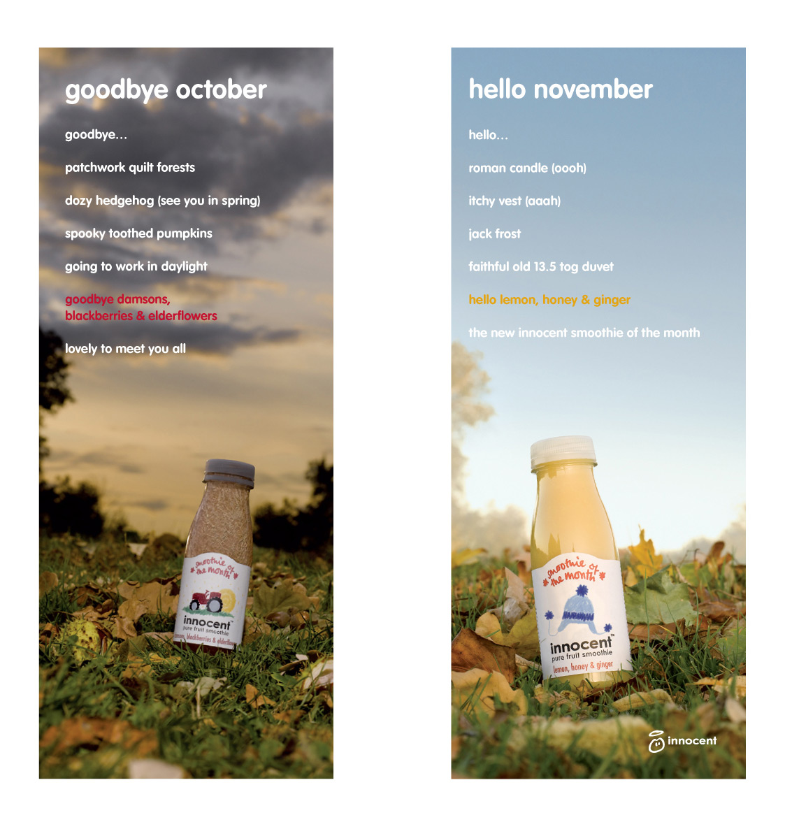 Пока октябрь! Привет ноябрь! Работа Lowe London для InnocentФруктовые напитки пот брендом Innocent имеют одну очень интересную особенность, которая отличает их от аналогичных товаров других производителей. Это ингредиенты, которые входят в состав, они подобраны таким образом, что ассортимент вкусов состоит из овощей и фруктов, встречающихся в каждом месяце в году.Состав творческой группы Рекламное агентство: Lowe London, UK Копирайтеры: Simon Pearse, Emmanuel Saint M'leux |