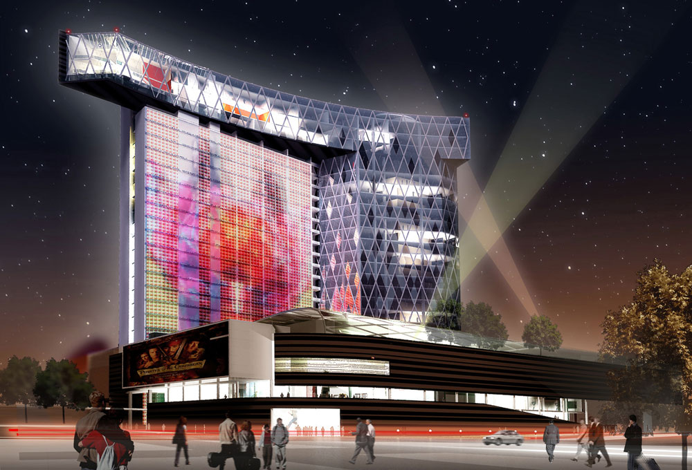 Фасад от АсадоваНа месте Черемушкинского рынка, по проекту мастерской Александра Асадова будет построен многофункциональный комплекс общей площадью 100 тысяч квадратных метров, включающий новый рынок и современные магазины, многозальный кинотеатр с развлекательным центром, а также отдельную изогнутую башню высотой 27 этажей, включающую офисы, гостиницу и панорамный ресторан. Что нам в этом проекте интересно больше всего, — гостиничный фасад этого комплекса, площадью 3 тысячи квадратных метров, станет первым полноценным media-фасадом в России. Строительство здания планируется начать уже в 2008 году. В фасаде будут использованы LED-светильники — приборы на базе массива точечных полупроводниковых светодиодов, вмонтированных на легкую каркасную основу и управляемых компьютером. В зависимости от сигнала зажигается определенная комбинация диодов, формирующая один пиксель изображения. www.asadov.ruKAK.RU |