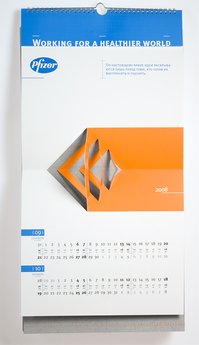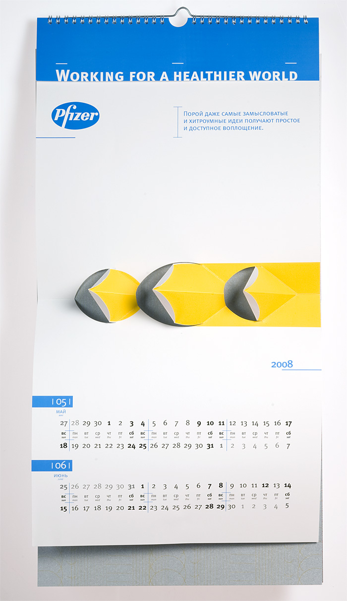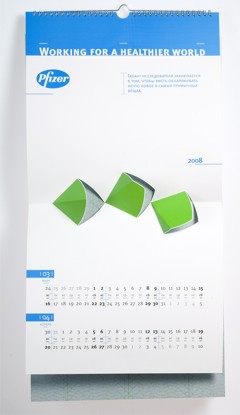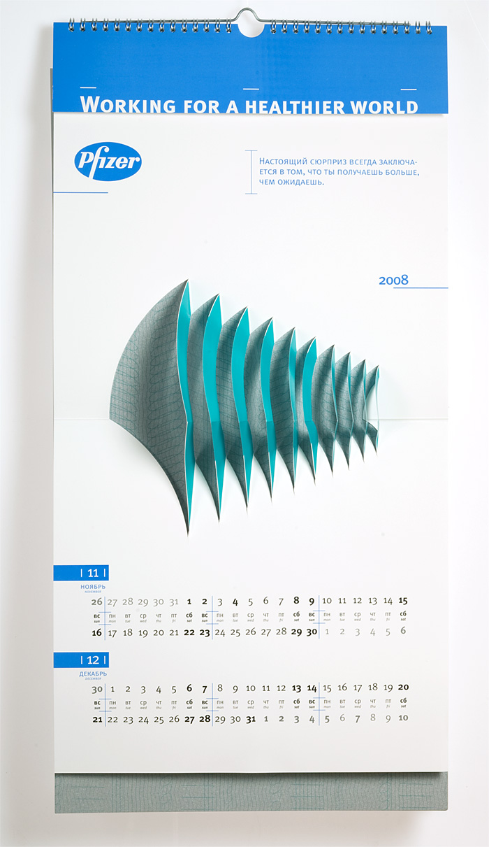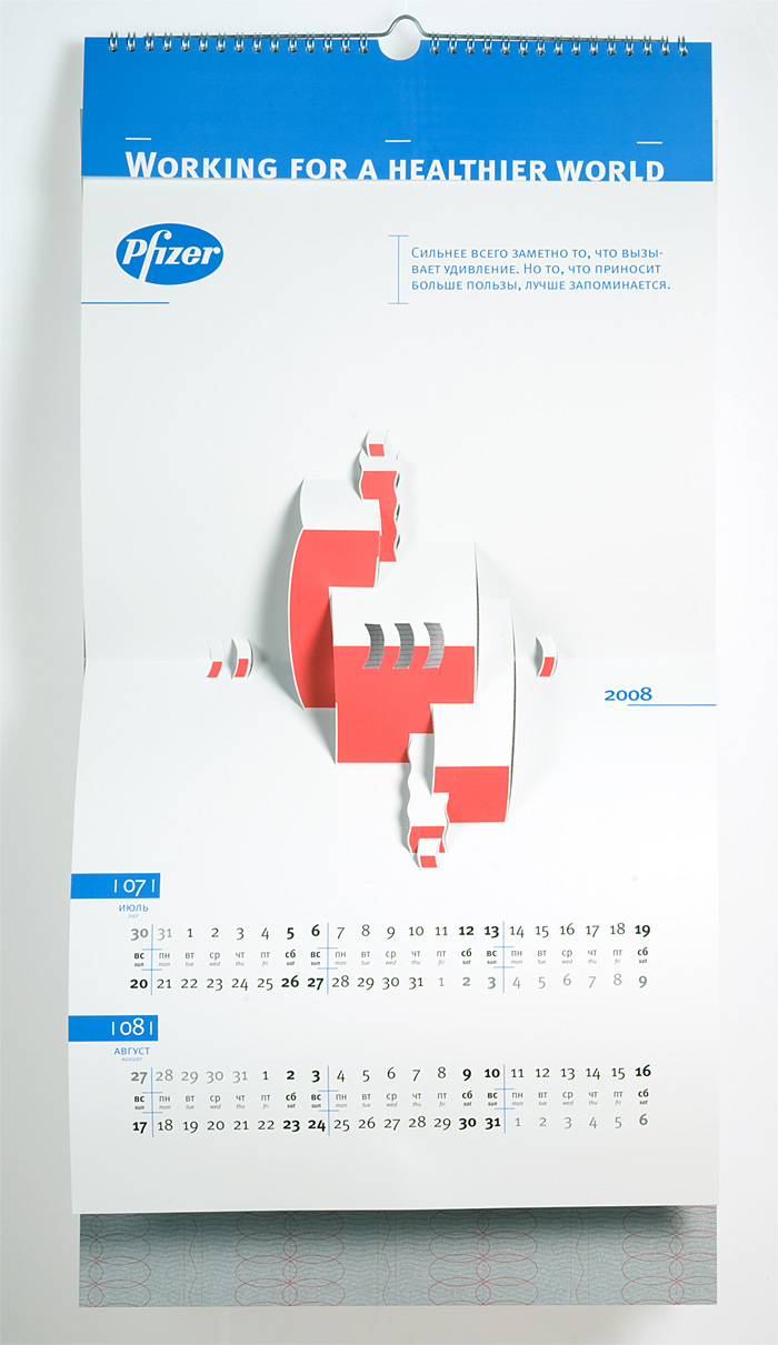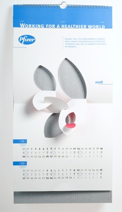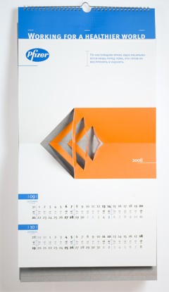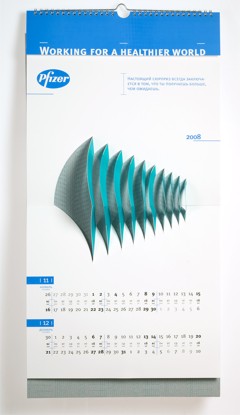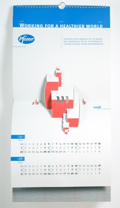 Повзрослевшая вырубкаРубеж 2007 и 2008 годов оставил след в истории отечественного буклето- и календарестроения, как эпоха возрождения старинной технологии объемных иллюстраций, получаемых методом фигурной вырубки. Ранее такая схема применялась в основном при изготовлении детских книг. Сегодня на смену волшебным замкам и меленкам, волкам и принцессам идут архитектурные сооружения, как существующие, так и проектируемые, а также промышленные механизмы и товары-прототипы.А в визуально-коммуникационной группе «Дизайн Депо» подошли к объемным картинкам, как к чистому искусству. Не обязательно апеллировать к ностальгии по детству, рассудили дизайнеры – календарь для российского офиса фармацевтической компании Pfizer, призванный донести до аудитории идею технологичности и инновационности, содержит абстрактные, лаконичные и остроумные композиции. Какую в итоге идею «коммуницирует» конечный продукт – уже не столь важно. Главное, что забавная полиграфическая игрушка, а значит – и логотип заказчика, цепляет взгляды. Аккуратно, стильно, качественно.