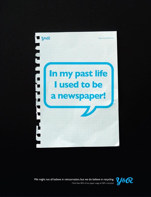 Y&R пользуется только переработанной бумагойКак можно понять из этих принтов, арабское подразделение агентства Y&R заботится об окружающей среде, используя вторичную бумагу и отдавая ее впоследствии на переработку. Именно поэтому тетради Y&R были раньше газетами, а конверты станут пакетами.Надпись: "В своей прошлой жизни я был газетой. В своей следующей жизни я буду сумкой для покупок. Мы не все можем верить в реинкарнацию, но мы верим в переработку. Более 80% бумаги, используемой в Y&R, перерабатывается." Агентство: Y&R, Абу-Даби, ОАЭ Творческий директор: Ramzy Haddad Арт директор: Farah Faour Копирайтер: Charlotte Danby |