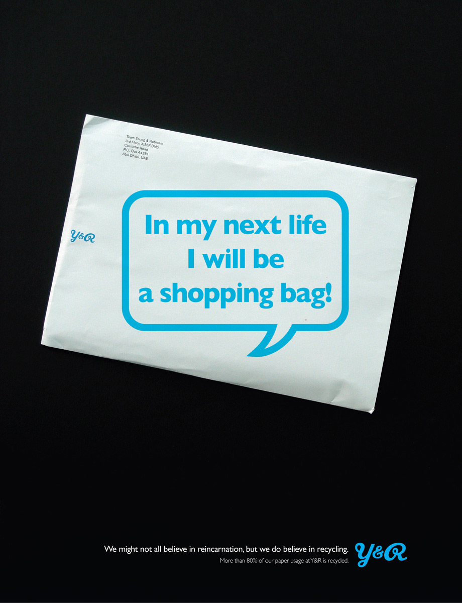 Y&R пользуется только переработанной бумагойКак можно понять из этих принтов, арабское подразделение агентства Y&R заботится об окружающей среде, используя вторичную бумагу и отдавая ее впоследствии на переработку. Именно поэтому тетради Y&R были раньше газетами, а конверты станут пакетами.Надпись: "В своей прошлой жизни я был газетой. В своей следующей жизни я буду сумкой для покупок. Мы не все можем верить в реинкарнацию, но мы верим в переработку. Более 80% бумаги, используемой в Y&R, перерабатывается." Агентство: Y&R, Абу-Даби, ОАЭ Творческий директор: Ramzy Haddad Арт директор: Farah Faour Копирайтер: Charlotte Danby |