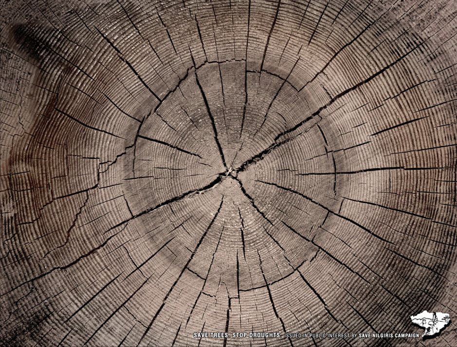 Кампания по спасению Нильгири призывает беречь деревьяВсем известно, что деревья препятствуют растрескиванию почвы при засухе и опустыниванию. Именно поэтому для индийского народа так важна охрана лесов в так называемых Голубых горах Нильгири. Используя фотографию среза дерева, агентство Triton Communications призывает нас беречь деревья.Надпись: "Спаси деревья. Останови засуху" Агентство: Triton Communications, Бангалор, Индия Творческий директор / Копирайтер: Sanjoy Datta Арт директор: Deepak Pattar |