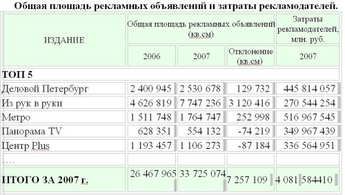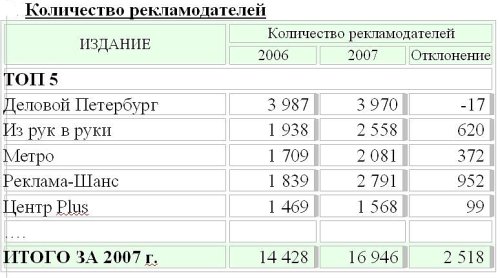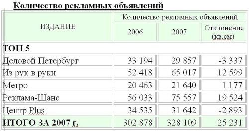 Всего, по словам специалистов ИФ «Гортис» в Петербурге насчитывается более 1 тыс. разноформатных изданий, при этом, по словам Олега Евстафьева, директора по маркетингу Metro, 50% рынка рекламы в прессе «делают» 5 изданий, входящих в топовую «пятерку» по результатам мониторинга «Гортиса». По данным этой исследовательской компании за 2007 год, количество рекламодателей в этих изданиях выросло – за исключением «ДП», где оно сократилось с 3 987 (2006 год) до 3 970 в 2007-м. Также в этом ежедневном издании, по данным «Гортиса», сократилось количество площадей рекламных объявлений (на 3 337 кв.см).