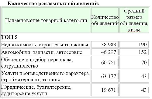 Что касается рекламодателей печатных изданий, то топовая «пятерка» выглядит следующим образом: недвижимость, строительство; автомобили, запчасти, сервис; обучение и подбор персонала; услуги производственного характера, а также юридические, бухгалтерские и аудиторские услуги.