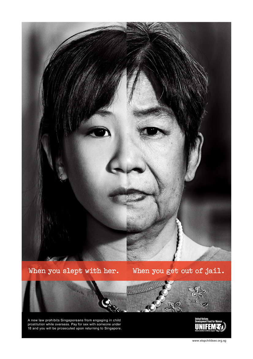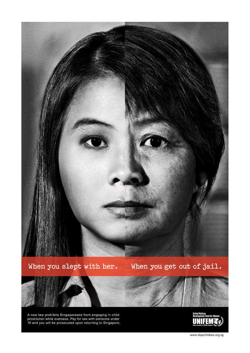 Unifem сообщает, за что теперь будут сажать сингапурцевСингапурский фонд Unifem сообщает, что в Сингапуре принят закон, по которому уголовную ответственность несут люди, которые переспали с несовершеннолетними не только на родине, но также и за границей. Чтобы рассказать, что ждет таких мужчин, агентство Bartle Bogle Hegarty показало нам девушек, с которыми они переспали, после того, как преступники выйдут из тюрьмы.Надпись: "Когда ты переспал с ней / Когда ты вышел из тюрьмы" Новый закон запрещает сингапурцам участвовать в детской проституции за границей. Заплатил за секс с кем-то младше 18, и ты будешь преследоваться по закону после возвращения в Сингапур." Агентство: Bartle Bogle Hegarty, Asia-Pacific, Сингапур Творческий директор: Todd Waldron Арт директор: Ross Ventress, Ian Perkins Копирайтер: Todd Waldron, Marthinus Strydom Фотограф: Yang Tang Производство: Groovy Studio Ретушь: Lay Leng / Procolor Imaging Продюсер агентства: Xenia Tan |