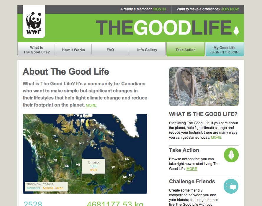 Канадец, измени образ жизни - спаси планету!Организация WWF призывает канадцев со страниц Интернет-ресурса THEGOODLIFE внести в свою жизнь простые изменения, которые помогут в борьбе с изменением климата на планете.Состав творческой группы Рекламное агентство: zig, Canada Творческий директор: Martin Beauvais Арт директор: Craig Ferguson Копирайтер: Steven Barr Дизайнеры: Michelle Donnelly & Genevieve Beharry Дополнительный веб дизайн: End Communications |
