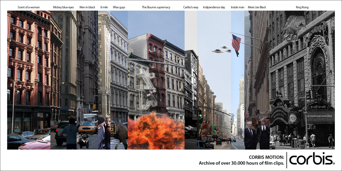 Corbis Motion предоставит вам огромный выбор видеороликов из фильмовВо всемирно известной коллекции принтов и роликов Corbis можно обнаружить более тридцати тысяч видеоклипов из множества фильмов. Именно об этом говорят нам принты, на которых из кусочков разных фильмов составлен пейзаж 5ой Авеню и изображение нью-йоркского такси.Надпись: "Corbis Motion: Архив более 30,000 часов клипов из фильмов." Арт директор: Andrea Salvaneschi Копирайтер: Benedetta Lucca, Viviana La Spina, Antonella Avossa |