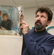 Для Петрова очень важна техника создания рисунков: изображение наносится тонким слоем масляной краски на стекло, просвеченное особым образом снизу, что создает эффект акварели, ощущение воздуха. Причем кистью мастер пользуется редко, предпочитая рисовать исключительно пальцами.