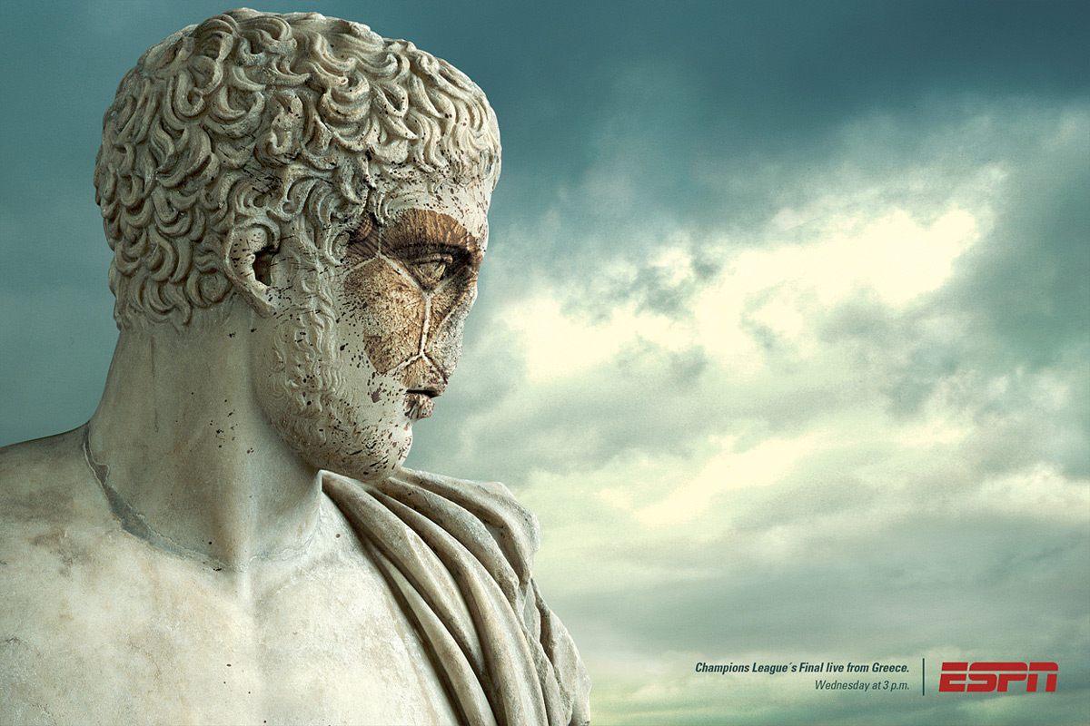 ESPN покажет, что происходит в Греции во время чемпионатовДаже статуи могут получить по морде, когда финал Лиги Чемпионов проходит в Греции, заявляет бразильское рекламное агентство Neogamabbh. А счастливые бразильцы могли наблюдать за этой неповторимой игрой благодаря каналу ESPN, которое транслировало прямое включение из Греции.Надпись: "Прямое включение Финала Лиги Чемпионов из Греции." Агентство: Neogamabbh, Сан-Паулу, Бразилия Творческий директор: Alexandre Gama Арт директор: Thiago Rocha, Marcelo M. Leite Копирайтер: Thomaz Dantas Иллюстратор: Daniel Leao Фотография: Getty Images |
