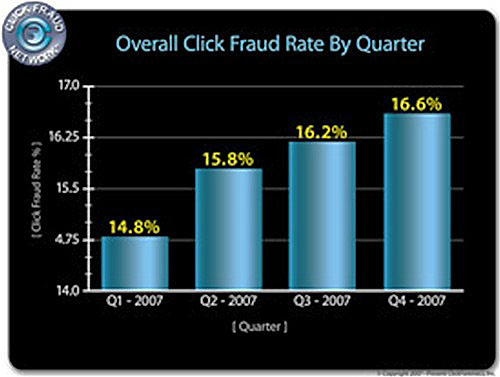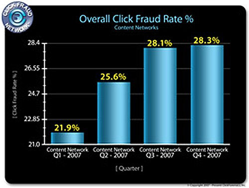 Уровень «фальшивых кликов» по рекламным носителям, размещенным с оплатой за клик (pay-per-click) в сетях контекстной рекламы (таких как Google AdSense и Yahoo Publisher Network), был еще выше и в четвертом квартале 2007 года составил 28,3%. Это также гораздо выше, чем 19,2% «фальшивых» кликов, которые делались по текстовым объявлениям в этих сетях в 4-м квартале 2006 года и 28,1%, которые были зафиксированы в третьем квартале 2007 года.