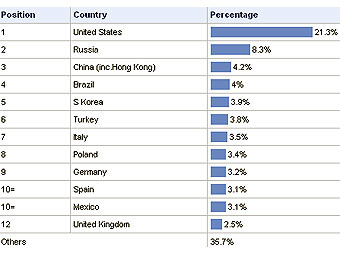 Россия вышла на второе место в мире по количеству спамаЗа последний квартал 2007 года Россия вышла на второе место в мире по количеству рассылаемого спама. Об этом говорится в отчете, опубликованном на сайте антивирусной компании Sophos. В соответствии с отчетом, страной, с территории которой рассылается больше всего спама, по-прежнему остаются США. Их доля в объеме всех "мусорных" рекламных рассылок составила 21,3 процента. Россия с 8,3 процента вытеснила со второго места Китай, которому удалось сократить объем рассылаемого спама до 4,2 процента и занять третье место. За Китаем в списке главных стран-спамеров идут Бразилия, Южная Корея, Турция, Италия, Польша, Германия, Испания, Мексика и Великобритания. На долю этих 12 стран приходится почти 65 процентов всей мировой спам-рассылки. Между тем, "Лаборатория Касперского" опубликовала отчет о спам-активности в России в январе 2008 года. По данным отчета, в этом месяце средняя доля почтового мусора в России выросла до 84,6 процента от общего количества отправленных писем. Самый низкий показатель был зафиксирован 28 января и составил всего 73,1 процента, а самый высокий - 97,3 процента - наблюдался в первый день года. Чаще всего январский спам рекламировал лекарства и прочие товары и услуги для здоровья, их доля в общем объеме составила 48,1 процента. Следом за лекарствами идет реклама образовательных услуг - 9,3 процента, реклама товаров и услуг "для взрослых" - 5,2 процента, реклама туристических предложений - 4,7 процента и услуги по электронной рекламе - 4,2 процента.![]() LENTA.RU |