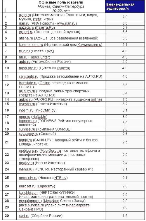 КОМКОН посчитал виртуальные предпочтенияКомпания КОМКОН завершила обработку данных пилотной волны регулярного исследования Web-Rating, изучающего предпочтения российских пользователей сети Интернет. Как рассказали AdLife.spb.ru в компании, согласно данным исследования TGI-Russia, которое в данном случае выступает в качестве установочного, еженедельных пользователей Сети в двух российских столицах насчитывается 4,4 млн. человек, что составляет 46,8% жителей этих двух городов в возрасте 16-55 лет (данные на момент проведения опроса – октябрь 2007 г.). Напомним, что оффлайн-исследование TGI-Russia – это мониторинг стиля жизни и потребления россиян, который проводится компанией КОМКОН 4 раза в год (поквартально) начиная с 1995 г. по лицензии компании BMRB International, и охватывает 68 городов России при годовой выборке в 37 500 респондентов (19 000 домохозяйств). Проект Web-Rating реализуется совместно с компанией Spylog – в рейтинге участвуют те ресурсы, на которых установлен одноименный счетчик. Ежеквартальная выборка составляет 7500 респондентов, ежегодная – 30000. Аудитория ведущих поисковых/почтовых порталов оценивается отдельно на основе включенных в анкету вопросов об использовании их сервисов. Выборка пилотного опроса состояла из еженедельных пользователей Всемирной паутины, в возрасте 16-55 лет, проживающих в Москве и Санкт-Петербурге. По данным исследования Web-Rating, среди еженедельной аудитории Интернета в этом возрасте 70% чаще всего подключаются к сети дома и 30% - на работе. Результаты исследования также показали, что посещение новостных ресурсов в равной степени характерно как для домашней, так и для офисной аудитории Сети. Исключение составляют развлекательные ресурсы, которые перемещаются на топовые позиции рейтинга ресурсов среди домашнего сектора. И наоборот, серьезные издания смещаются вниз. Следует обратить внимание на активность аудиторий. Каждый пользователь Интернета в Москве и Санкт-Петербурге в среднем посещает около 50 тематических ресурсов в месяц, но только на 10 из них он заходит каждую неделю. Рейтинги тематических ресурсов домашнего и офисного сектора по объему еженедельной аудитории выглядят следующим образом:![]() ![]() ![]() adlife.spb.ru |