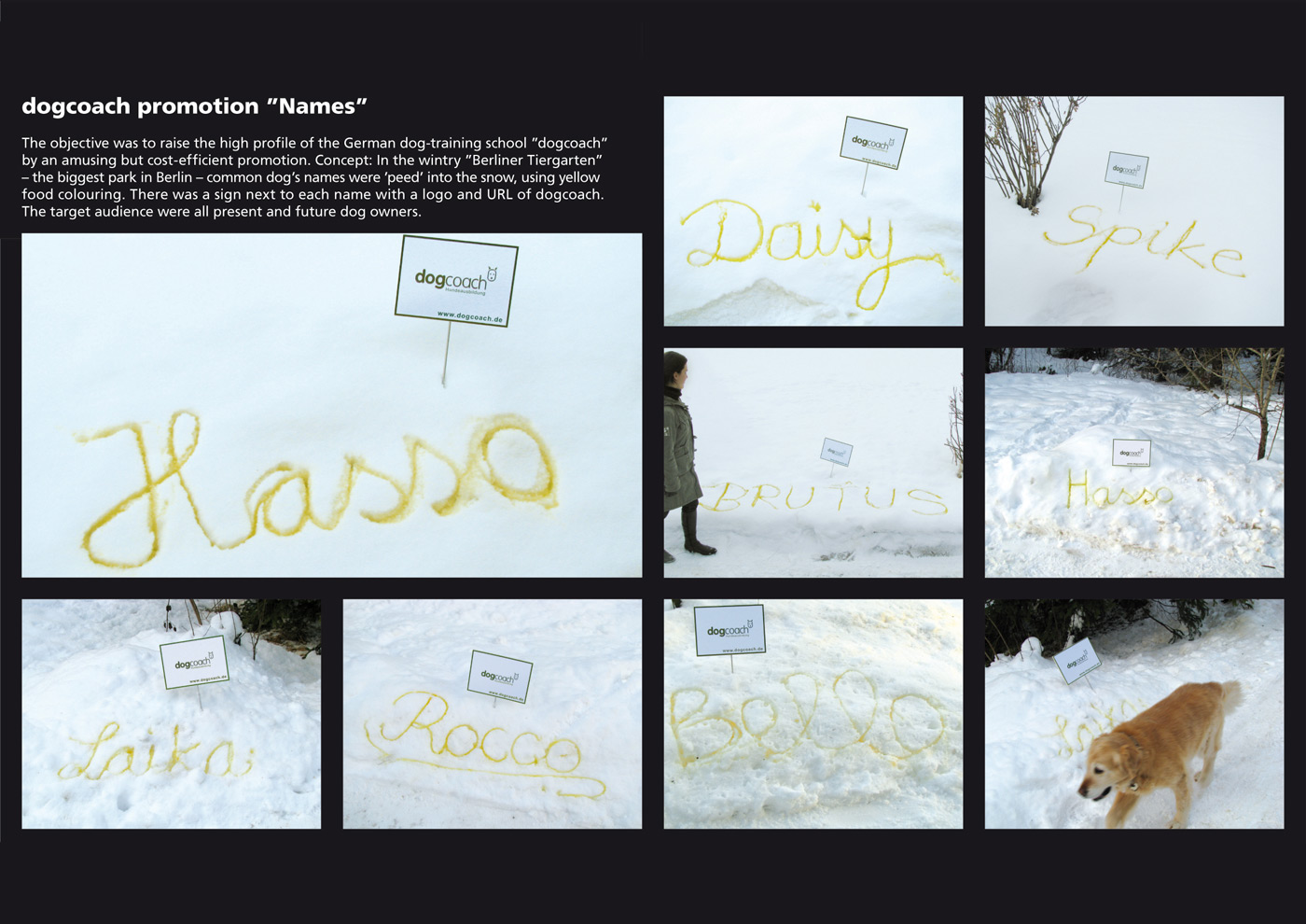 Реклама собачьей школы Dogcoach - желтым по беломуМюнхенское агентство .start применило весьма необычный ход для рекламы немецкой школы по дрессировке собак Dogcoach. При помощи желтой пищевой краски в одном из самых больших берлинских парков на снегу были прописью написаны имена собак. Не сложно догадаться на что это было похоже…Рядом с надписью поставили табличку с названием школы и ее адресом в Интернете. Таким образом, агентство надеялось привлечь внимание будущих и нынешних владельцев собак. Агентство: .start, Мюнхен, Германия Творческий директор: Marco Mehrwald, Thomas Pakull Арт директор: Felix Ranft Копирайтер: Bjoern Pfarr |