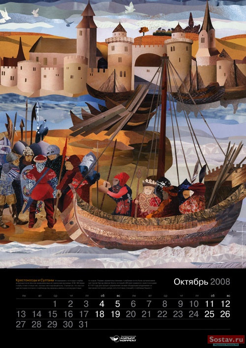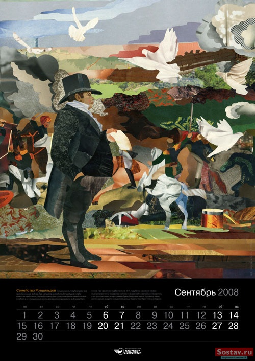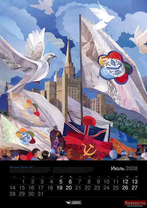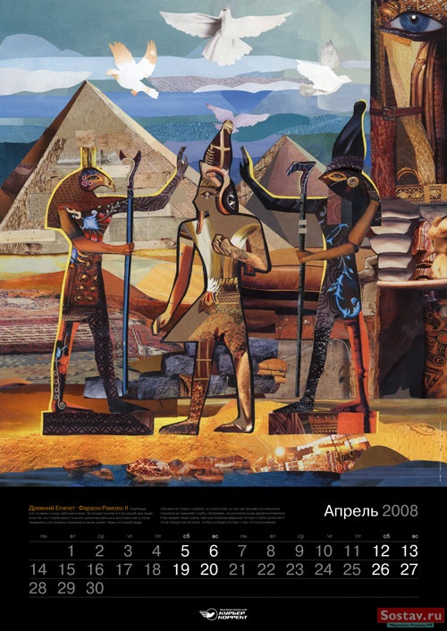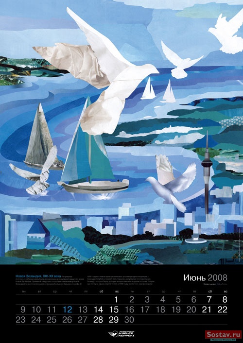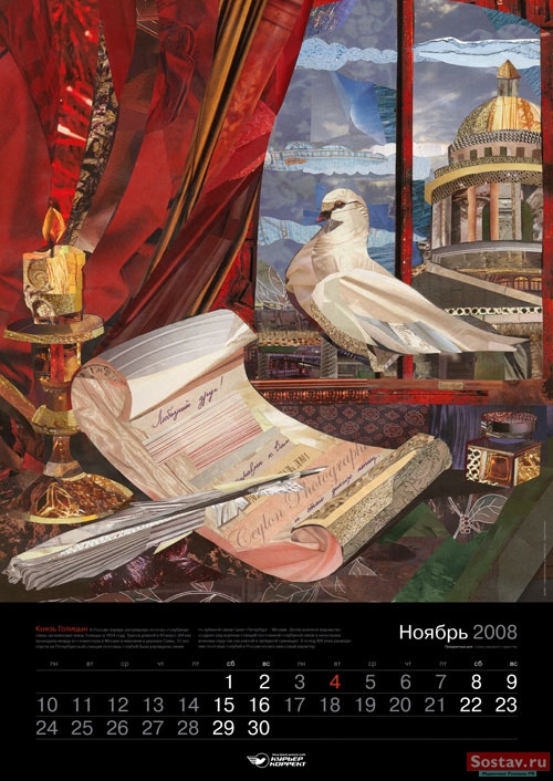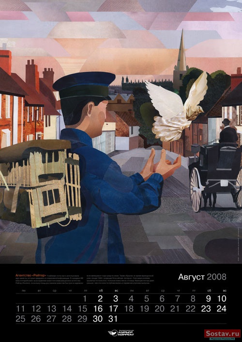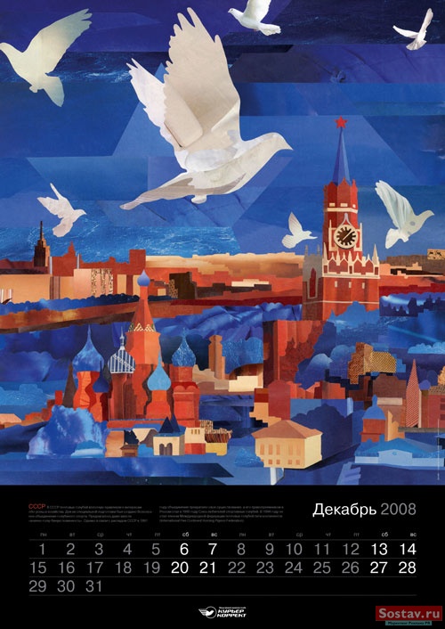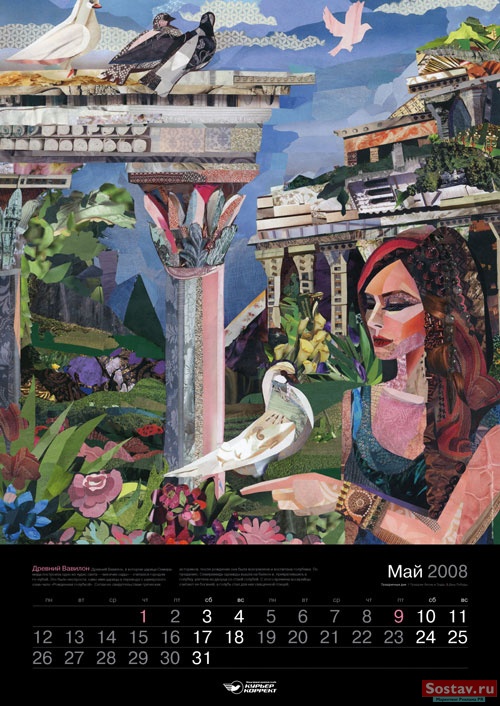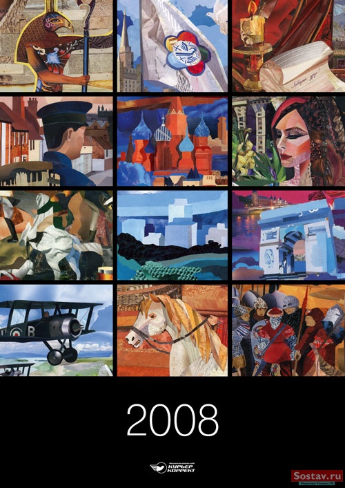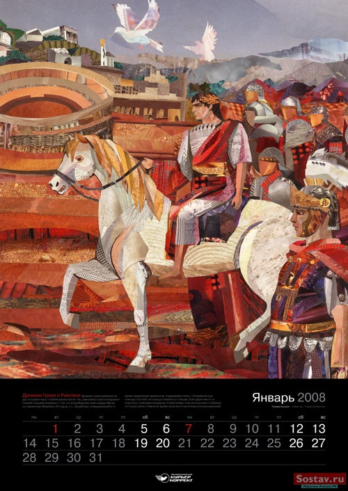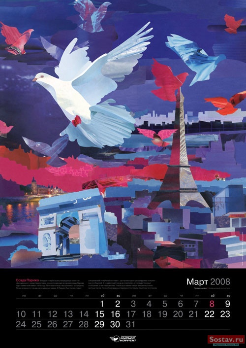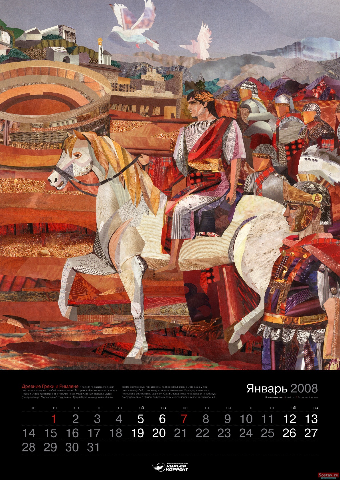 Студия ArtGraphics.ru разработала дизайн календаря для компании "Курьер Коррект"В рамках создания масштабного дизайн-проекта фирменного стиля для компании «Курьер Коррект», включающего более 40 различных носителей, студия ArtGraphics.ru разработала дизайн настенного перекидного календаря. Символом компании является почтовый голубь , поэтому мы решили рассказать о влиянии голубей на ход истории. С древних времен люди использовали голубей для доставки важных сообщений. Двенадцать полос календаря иллюстрируют сюжеты, от Древнего Египта до наших дней. Была выбрана специальная коллажная техника, позволившая получить уникальные, большие и красочные изображения на заданную тему. Полосы календаря хорошо выглядят издалека, в то же время они визуально интересны и при детальном рассмотрении. Каждая полоса - неповторимая мозаика из кусочков рекламных модулей. В процессе создания коллажей было изрезано ножницами около 200 журналов и каталогов. Еще до конца декабря клиенты и сотрудники компании «Курьер Коррект» с удовольствием разобрали весь тираж, в результате разработчику досталось только 10 экземпляров :о) Увидеть оригинальный календарь и склеенные коллажи полос можно в офисе студии ArtGraphics.ru Состав творческой группы