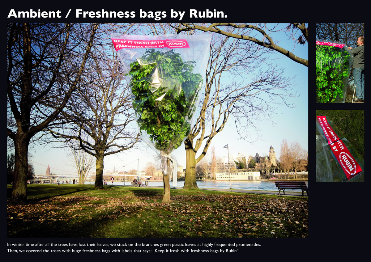 Зимой и летом - одним цветом, с помощью пакетов RubinДля того чтобы донести до ЦА, что пакеты от компании Rubin сохраняют вашу пищу свежей, немецкое агентство Publicis Frankfurt украсило зимнее дерево искусственными листьями, и завернула его в пакет Rubin. Тем самым давая понять, что под защитой данного пакета дереву не страшна ни зима, ни морозы.Состав творческой группы Рекламное агентство: Publicis Frankfurt, Germany Творческие директора: Stephan Ganser, Nico Juenger, Peter Kaim Арт директора: Hendrik Frey, Evelyne Werner Копирайтер: Konstantinos Manikas Фотограф: Johannes Krzeslack |