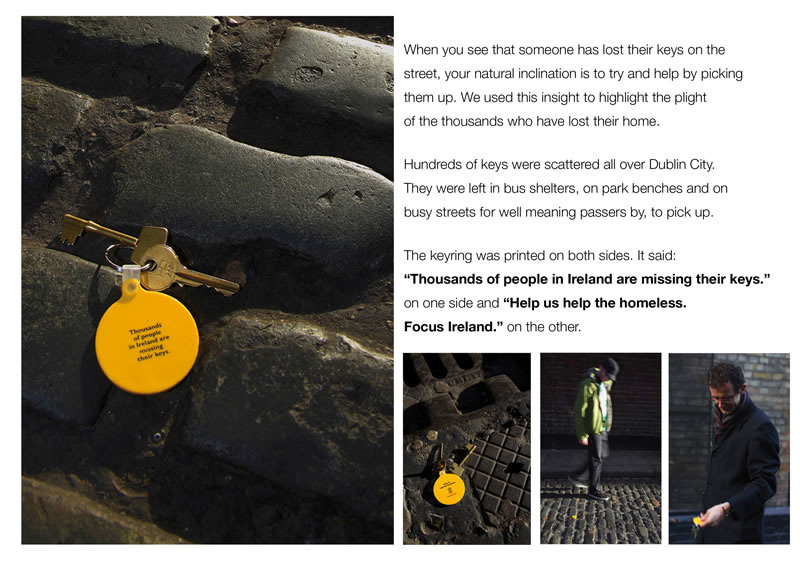 Focus Ireland: потерянные ключи и помощь бездомнымКогда вы идете по улице и видите, что кто-то потерял ключи и безрезультатно пытается их найти, вы, конечно же, постараетесь помочь несчастному. Агентство Chemistry Strategic Communications изготовило сотни ключей, которые имели бирку с призывом помочь бездомным людям. Ключи были разбросаны по улицам Дублина.Надпись: "Тысячи людей в Ирландии теряют ключи. Помогите нам помочь бездомным людям. Focus Ireland" Состав творческой группы Рекламное агентство: Chemistry Strategic Communications, Ireland Творческий директор: Mike Garner Арт директор: Nicole Sykes Копирайтер: Ann Fleming |