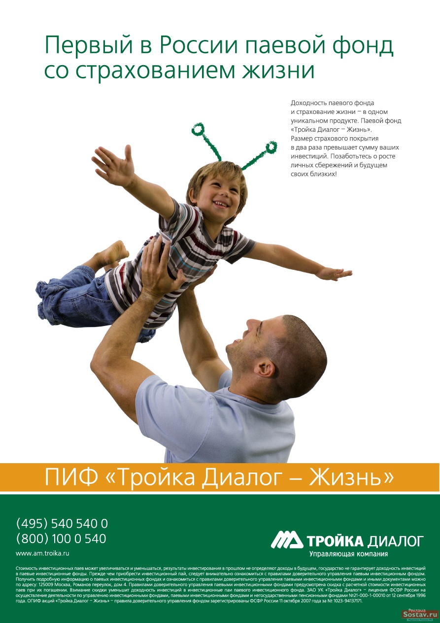 Кошелек и жизнь. Рекламное агентство Paradigma выиграло тендер на разработку рекламного образа для нового паевого фонда "Тройка Диалог-Жизнь" с услугой страхования жизниВ конце 2007 года Управляющая компания "Тройка Диалог" разработала уникальный продукт: паевой фонд, совмещенный со страхованием жизни. Такого предложения, на стыке двух востребованных финансовых услуг, не делал еще никто."Когда есть реальная, а не выдуманная новизна продукта - грех это не использовать. Новое привлекает, а когда есть интерес - будет и понимание, пусть даже и довольно сложной для восприятия информации", - говорит Илья Ноткин, отвечавший за стратегию коммуникаций со стороны агентства. "Нам удалось найти правильные слова и понятный образ. Были и более сложные, оригинальные решения, но мы уважаем и разделяем выбор клиента, который отдал предпочтение простоте и прозрачности", - добавляет Кирилл Латышев, креативный директор "Парадигмы". В настоящее время рекламная кампания фонда "Тройка Диалог-Жизнь" проходит на носителях наружной рекламы, радио и в печатных СМИ. Состав творческой группы Paradigma Communication Agency: Директор по стратегическому планированию и работе с клиентами - Илья Ноткин Креативный директор - Кирилл Латышев Арт-директор - Ольга Кабисова |