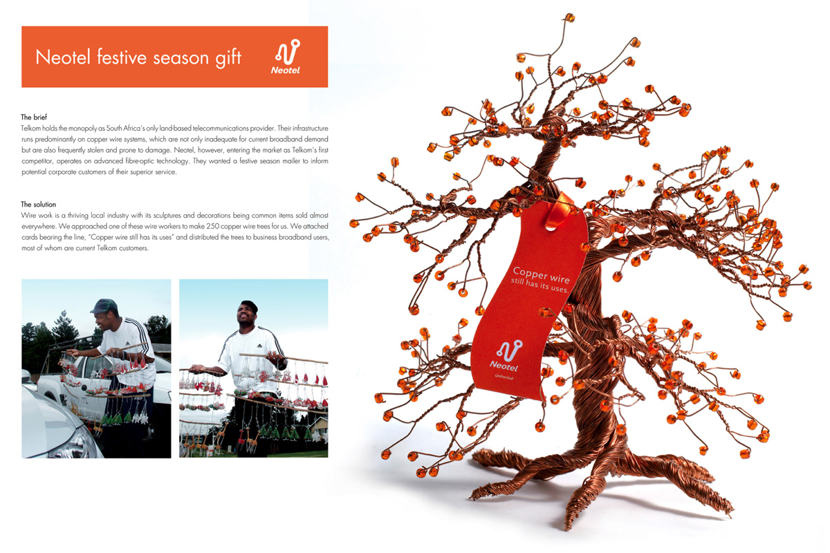 TBWA, Johannesburg: роща медных деревьев или поддержим прогрессTelkom является компанией монополистом по предоставлению услуг телекоммуникаций на территории Южной Африки. Инфраструктура имеет наземное базирование и состоит в целом из медных кабелей, которые с успехом крадутся местным населением для последующей сдачи в пункты приемы. Компания Neotel выходит на рынок телекоммуникаций Африки, предоставляя услуги через фиброволокно. Агентством TBWA\Hunt\Lascaris было создано порядка двухсот деревьев из медной проволоки с прикрепленными на них бирками. Тем самым агентство пытается донести до общественности преимущества оборудования, с помощью которого компании Neotel предоставляет услуги.Надпись: "У медного провода по-прежнему есть применение" Состав творческой группы Рекламное агентство: TBWA\Hunt\Lascaris, Johannesburg, South Africa Исполнительный творческий директор: Damon Stapleton Творческий директор: Margie Backhouse Арт директор: Wihan Meerholz |