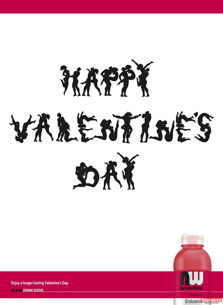 Любите друг друга в рекламе бренда Nutrient WaterNutrient Water поздравляет всех с Днем всех влюбленных. И не обязательно быть влюбленным в девушку или парня, можно и в сам напиток (которому можно отправить признание в любви на сайте bebo.com).Рекламно-романтичный принт бренда не старается претендовать на свежесть решения. Все просто - поздравление с праздником выложено буквами, в виде занимающихся любовью парочек. |