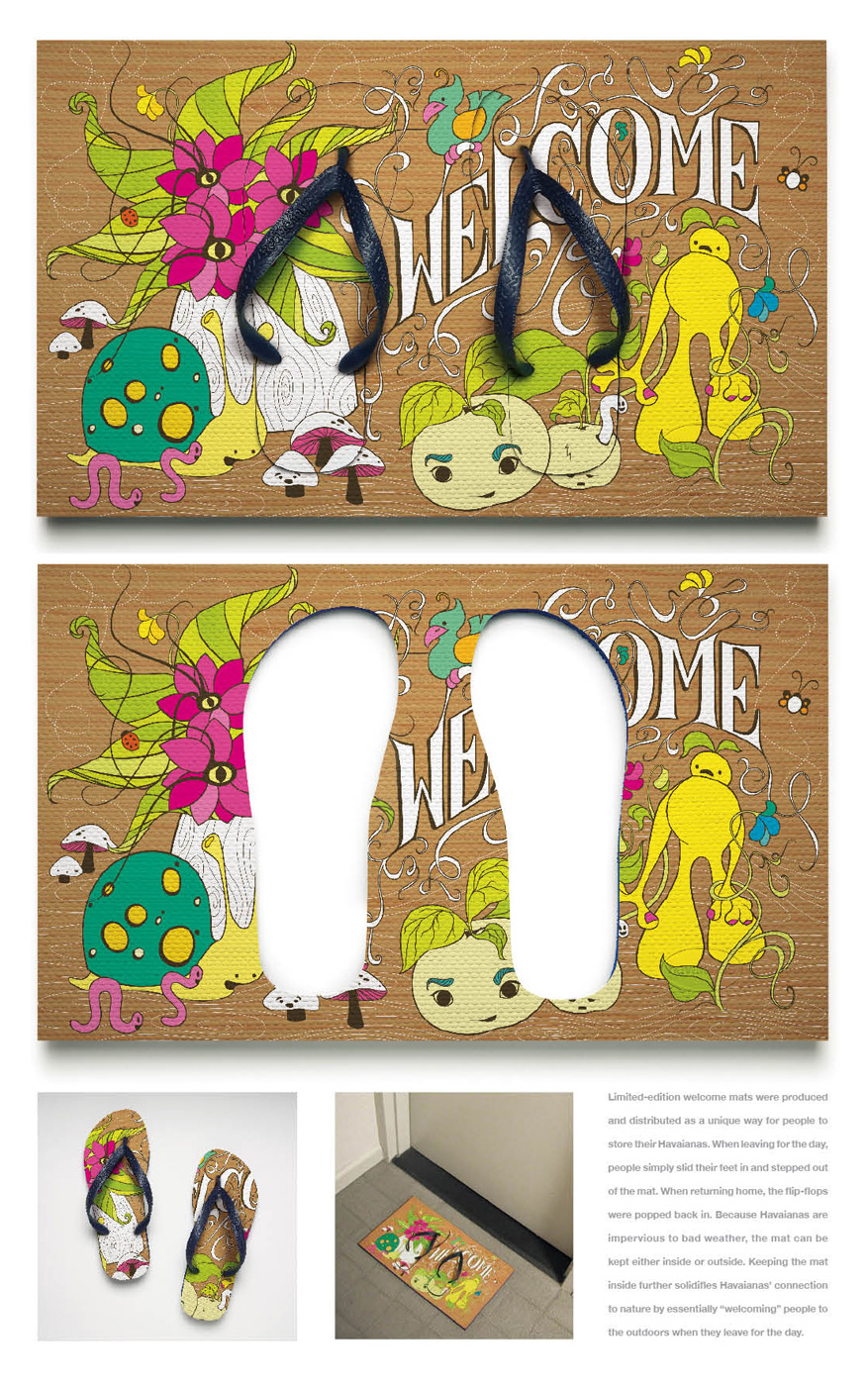 Необычные придверные коврики от HavaianasАмериканское агентство BBDO New York, создавая рекламную кампанию для бразильского бренда Havaianas, разработало и распространило уникальные коврики, которые обычно размещают при входе в дом или квартиру. Когда владелец такого коврика покидает свой дом, он просто просовывает ноги в шлепки и идет дальше, а возвращаясь обратно, оставляет их там же.Агентство: BBDO, Нью-Йорк, США Главный творческий директор: David Lubars, Bill Bruce Творческий директор: James Clunie Арт директор: James Clunie |