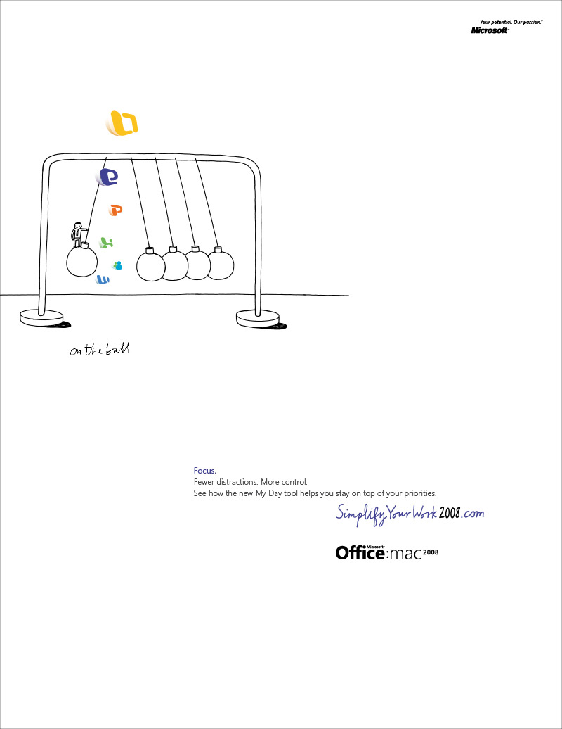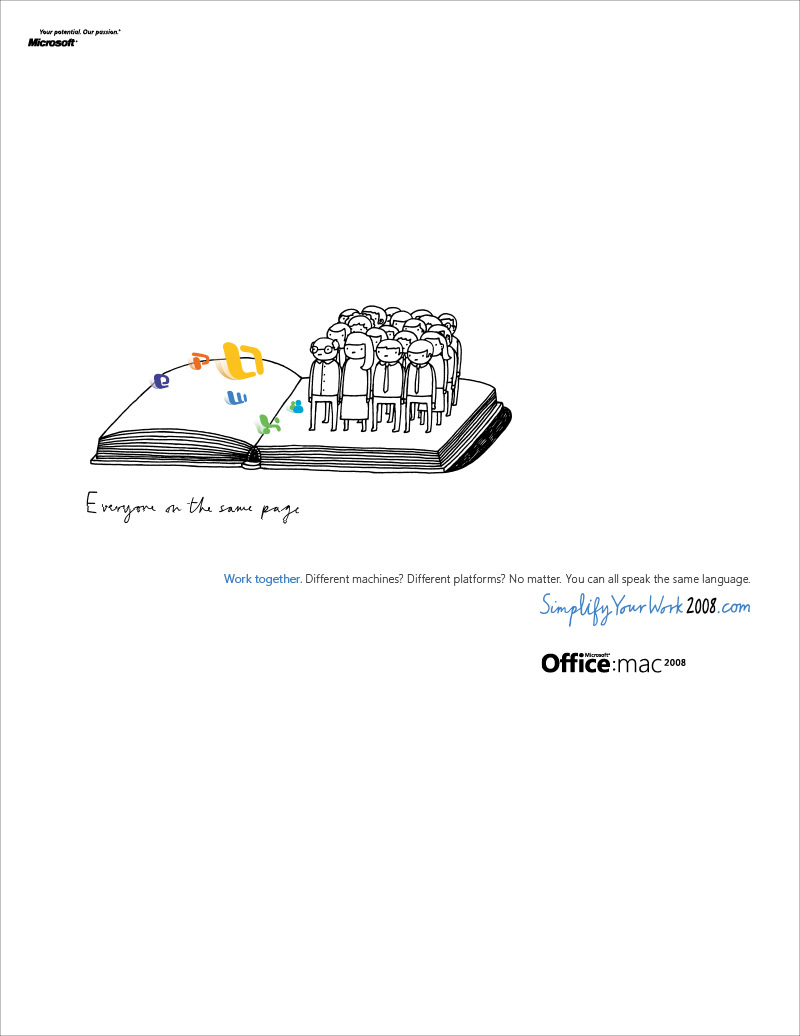 McCann Worldgroup рекламирует Microsoft Office: Mac 2008Не важно, какой у вас компьютер, на какой платформе вы работаете, с помощью Microsoft Office:Mac 2008 все будут общаться на одном языке. Новая версия популярного офисного пакета от Microsoft, по заявлению агентства McCann Worldgroup San Francisco, создавшего данные рекламные плакаты, содержит ряд инновационных улучшений, с помощью которых вы как никогда легко сможете решать поставленные перед вами задачи.Состав творческой группы Рекламное агентство: McCann Worldgroup San Francisco Творческое агентство: Rob Bagot, John McNeil Арт директор: Aviva Kapust Копирайтер: Juliana Cobb Иллюстратор: Mr. Bingo Продюсер: Rebecca Kidder |