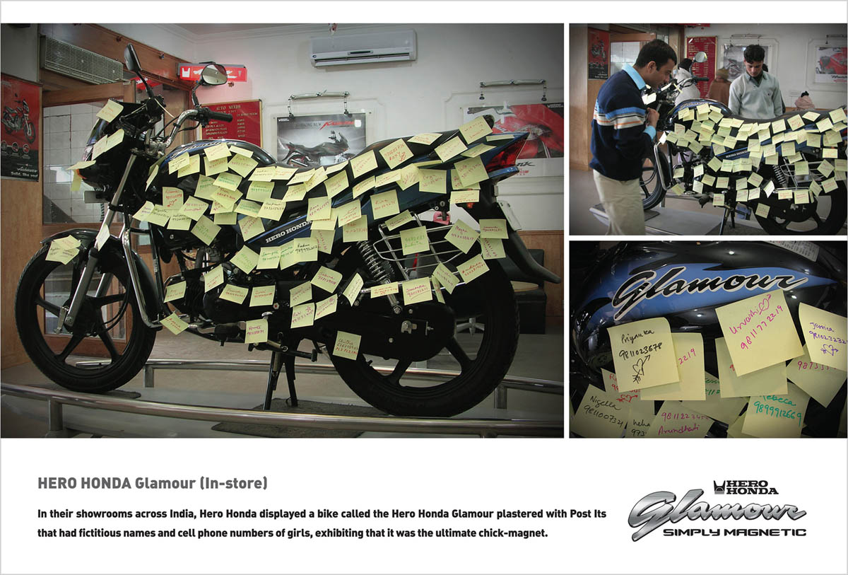 Манящий мотоцикл Hero Honda GlamourРекламное агентство JWT India подготовило для компании Honda необычную презентацию одного из их мотоциклов Hero Honda Glamour. В демонстрационном зале в Индии этот мотоцикл был полностью обклеен клейкими листочками Post-It, на которых были написаны имена и телефоны несуществующих девушек. Таким образом, нам показали, что этот мотоцикл так и притягивает к себе женский пол…Агентство: JWT, Нью-Дели, Индия Главный творческий директор: Agnello Dias Творческий директор: Rondeep Gogoi Арт директор: Sumonto Ghosh Копирайтер: Rondeep Gogoi |