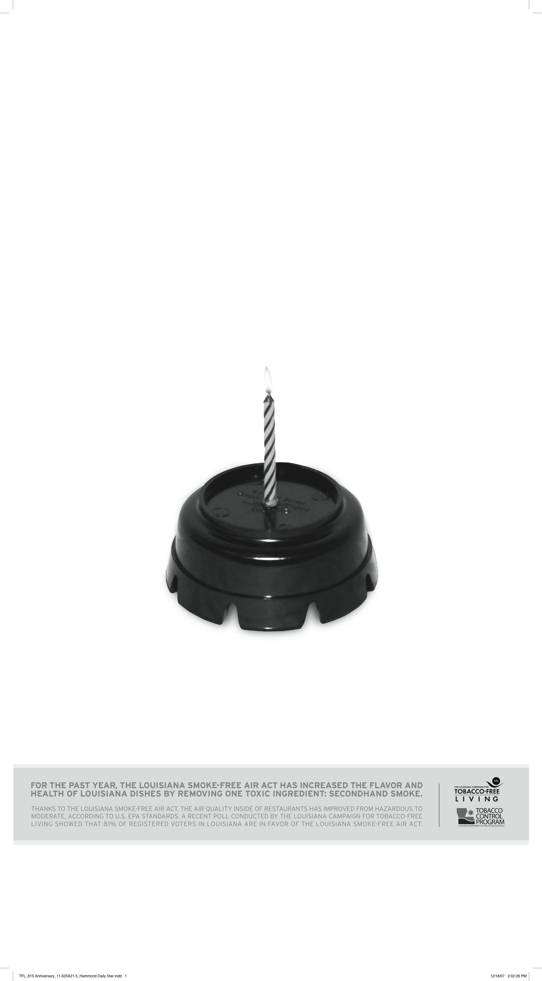 Один год без табака. Отпразднуем!Рекламное агентство Trumpet, расположенное в Нью-Орлеане, выпустило принт в поддержку кампании проходящей в Луизиане под названием "Жизнь без табака". Рекламный принт вышел на страницах печатных изданий.Перевернутая пепельница и свеча, должны донести до общественности, что, находясь в заведении для курящих, вы получаете точно такую же дозу никотина и смол, как и сами курильщики, да и просто находиться в задымленном помещении доставляет мало удовольствия. Рекламное агенство: Trumpet,New Orleans |