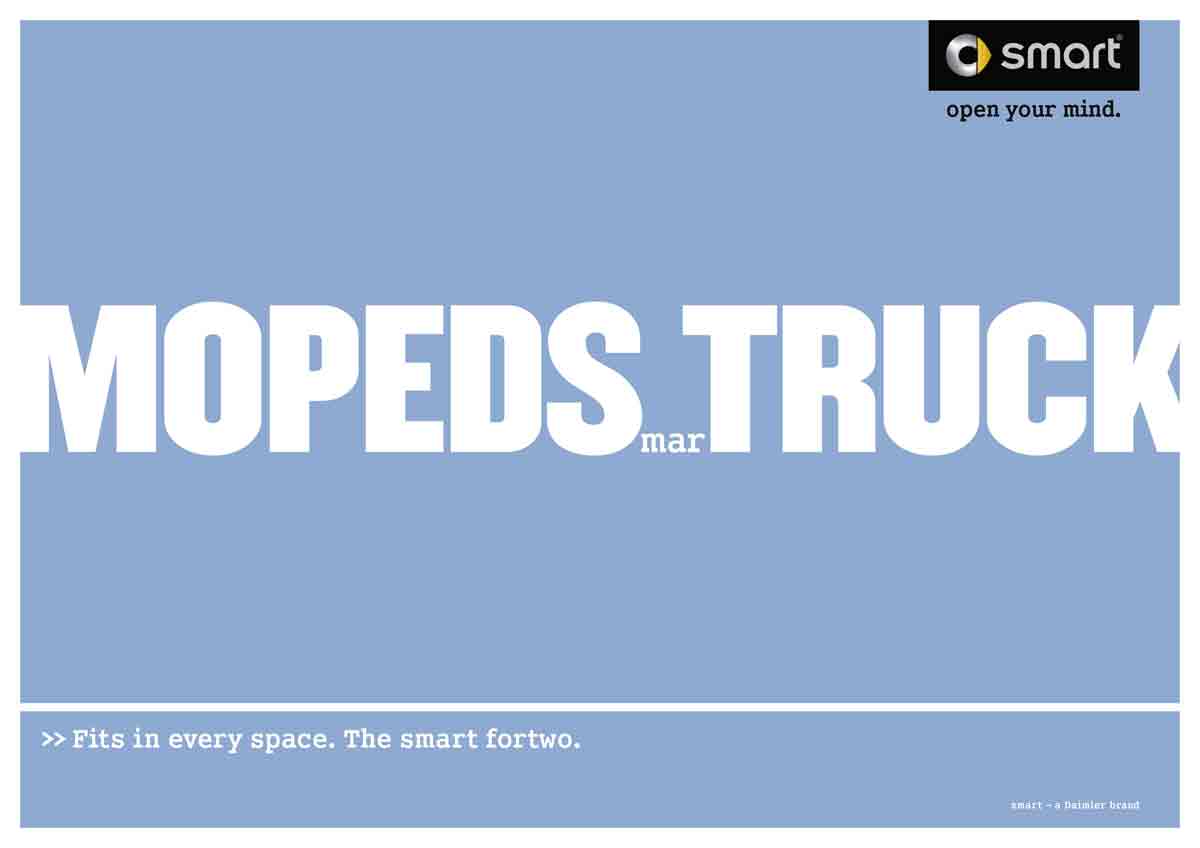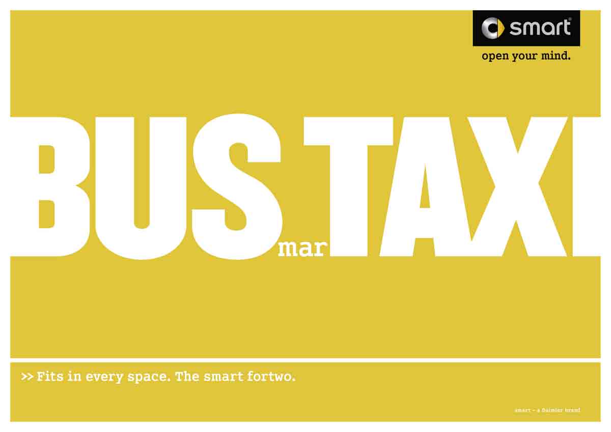 Smart помещается в любом местеКак заявляет нам немецкое рекламное агентство BBDO D?sseldorf, автомобиль SMART - это машина, которая благодаря своим размерам идеально подходит для городских условий. Дело в том, что она настолько компактна, что может втиснуться между автобусом и такси, дорожным знаком и деревом, мопедом и грузовиком.Надпись: "Помещается в любом месте. The smart fortwo." Агентство: BBDO D?sseldorf, Германия Творческий директор: Toygar Bazarkaya, Sebastian Hardieck, Carsten Bolk Копирайтер: Jacques Pense, Andreas Walter, Dennis Tjoeng Арт директор: Jacques Pense, Lena Tuczek |