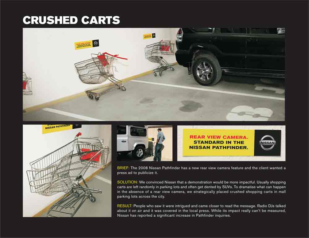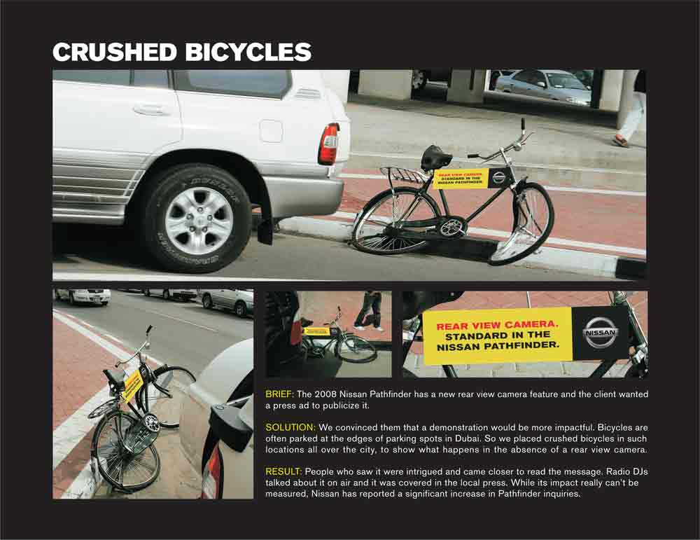 Помятые тележки и велосипеды? Реклама Nissan PathfinderЧтобы сообщить потенциальным покупателям, что стандартная комплектация внедорожника Nissan Pathfinder теперь оснащена камерой заднего вида, арабское агентство TBWA\RAAD предложило разместить на парковках города помятые тележки и велосипеды. Эта акция наглядно продемонстрирует, в какую ситуацию может попасть водитель, если у его машины нет камеры заднего вида.Надпись: "Камера заднего вида. В стандартной комплектации Nissan Pathfinder." Агентство: TBWA\RAAD, ОАЭ Главный творческий директор: Milos Ilic Помощник творческого директора: Sakib Afridi Арт директор: Sakib Afridi, Rishi Chanana Копирайтер: Sandeep Fernandes |
