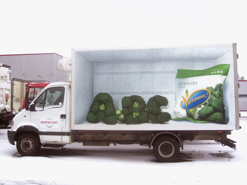 РА AVIATOR разработало дизайн оформления автомобилей, доставляющих продукцию "Vитамин" в розничные сети. Перед агентством стояла задача ярко и привлекательно визуализировать ключевое УТП марки: продукты "Vитамин" содержат больше витаминов, чем тепличные и длительно хранящиеся ягоды и овощи.