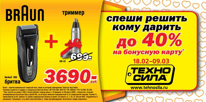 Торговая сеть "Техносила" запустила рекламную кампанию в поддержку своей новой акции "Спеши решить, кому дарить"Акция приурочена к двум праздникам: 23 февраля и 8 марта.Основная задача рекламной акции - привлечь покупателей выгодными предложениями, низкими ценами и индивидуальным подходом. "Техносила" решила предложить своим покупателям помощь в покупке большего числа подарков. Во время проведения акции каждому покупателю, совершившему покупку, дарится активированная бонусная карта, на которую зачисляются бонусы в зависимости от суммы самой покупки и, таким образом, на карточку можно получить до 40% от стоимости купленного товара. На эти бонусы покупатель может сразу же выбрать еще один подарок. Концепция, лежащая в основе креатива для новой акции "Спеши решить, кому дарить", носит весьма нетрадиционную стилистику. Это послание человека, который купил подарок в магазине "Техносила" и обращается в своем видеописьме с поздравлением к тому, кому он хочет вручить этот презент. Креативное бюро "Sahar", предложило оригинальную и неординарную идею снять ролики в формате home-video. Состав творческой группы: Торговая сеть "Техносила". Агентство: Sahar (Украина) Креативный директор - Алексей Сай Арт-директор - Тимур Камиров Копирайтер - Анна Гаврилют Начальник отдела по работе с клиентами - Евгения Судьенко Менеджер проекта - Ксения Гордеева Продакшн студия: radioaktivefilm Executive Producer - Дарко Скульский Director - Сергей Осипян DOP - Дмирий Юриков Producer - Дана Курыско 1st AD - Валентин Семко |