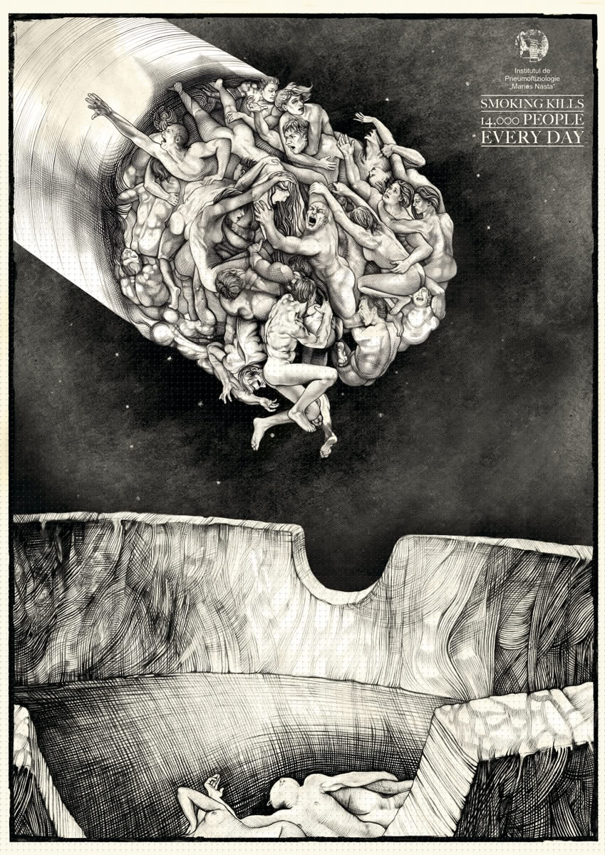 Агонизирующие жертвы курения Saatchi&Saatchi BucharestДля того, чтобы подчеркнуть важность приведенных на рекламном плакате данных, агентство Saatchi&Saatchi Bucharest изобразило агонизирующих людей, которые корчатся в муках на конце сигареты, заменяя собой сигаретный пепел.Надпись: "Курение убивает 14000 людей каждый день" Состав творческой группы Рекламное агентство: Saatchi&Saatchi Bucharest, Romania Творческий директор: Nick Hine Арт директор: Arturo Vittorioso Копирайтер: Jorg Riommi Иллюстратор: Mirco Brizi |