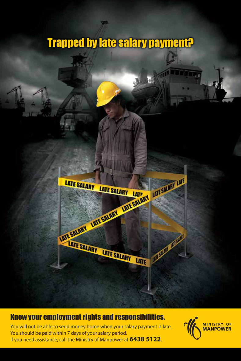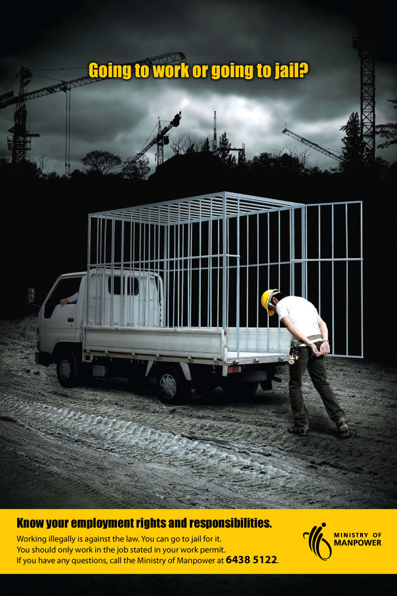 На работу, как на каторгу? Служба Ministry of Manpower решает проблемы трудоустройства сингапурцевАгентство CreAds Advertising из Сингапура разработало печатную рекламу для социальной службы Ministry of Manpower. Перед организацией стоит цель создания максимально конкурентно-способной рабочей силы, а также обеспечения большого количества рабочих мест для всех жителей Сингапура.На работу или в тюрьму? Знай свои права и обязанности на рабочем месте Работать нелегально - идти против закона. За это ты можешь попасть в тюрьму. Ты должен работать там, где у тебя есть разрешение. По каким-либо вопросам звони в Ministry of Manpower 6438 5122 Чувствуешь себя безопасно на работе, или пожалеешь? Знай свои права и обязанности на рабочем месте Ты защищен на работе от несчастных случаев установленными нормами безопасности Не рискуй своей жизнью. Следуй правилам По каким-либо вопросам звони в Ministry of Manpower 6438 5122 Задерживают выплату зарплаты? Знай свои права и обязанности на рабочем месте Ты не сможешь выслать деньги домой вовремя, если твою зарплату задерживают. Тебе должны платить за работу в течение семи дней после установленной даты По каким-либо вопросам звони в Ministry of Manpower 6438 5122 Рекламное агентство: CreAds Advertising, Singapore Арт-директоры: Helmut Matthijs, Ray Ticsay, Ching Li Копирайтер: Tzang M. Продакшн менеджер: Ronald Seet Медиа планирование: Anne Fabregas Роман Самоха, Sostav.ru |