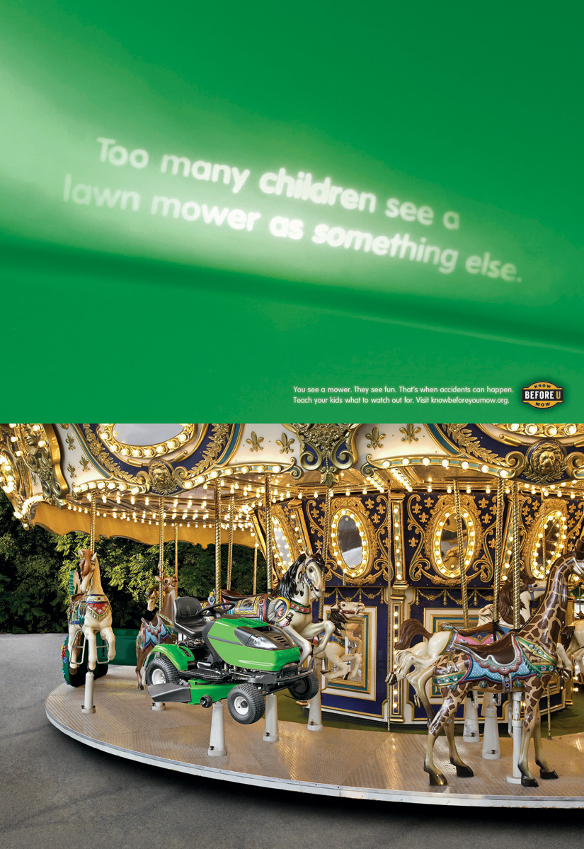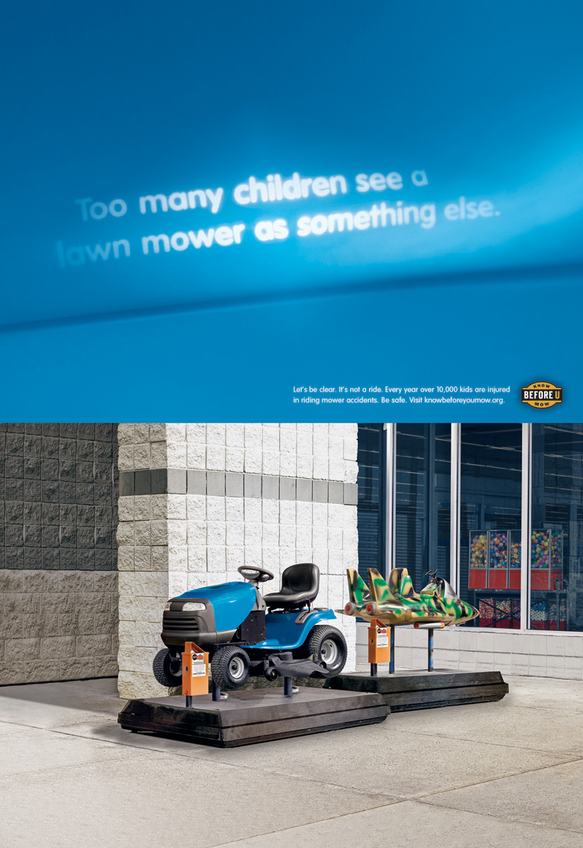 Не дай ребенку пострадать от газонокосилкиМногие маленькие дети воспринимают газонокосилку как что-то веселое и используют ее как объект для игр. Вследствие чего очень часто они получают травмы. Для того, что бы оградить детей от потенциально опасных вещей, американское агентство Serve выпустило данные плакаты, призывающие родителей объяснить детям о потенциальной угрозе.Состав творческой группы Рекламное агентство: Serve, Milwaukee, USA Творческий директор: Gary Mueller Арт директор: Mike Scalise Фотограф: Scott Ritenhour |