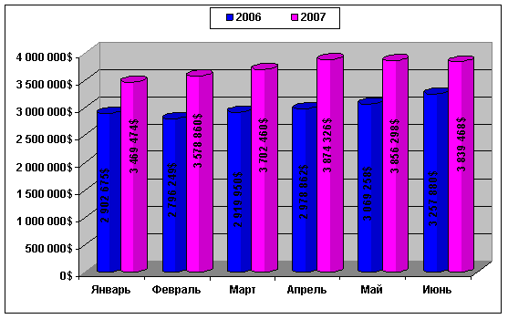 Объемы алматинского рынка наружной рекламы. (I полугодие 2007 года)По данным компании TNS Gallup Media Asia, затраты рекламодателей на размещение наружной рекламы в городе Алматы в I полугодии 2007 года составили 22 млн. USD В сравнении с I полугодием 2006 года, рынок наружной рекламы вырос на 24,5%. Более подробно динамику изменений рекламных бюджетов можно увидеть в Диаграмме 1. Диаграмма 1 - Сравнительная динамика изменений рекламных бюджетов по месяцам, 2006, 2007 гг. Примечание: расходы на размещение наружной рекламы приводятся в соответствии с официальными прайс-листами без учета скидок и льгот. При проведении мониторинга наружной рекламы учитывались все рекламные конструкции, начиная с сити-формата размером 1.2 х 1.8 м. Рекламу своих товаров и услуг на улицах города в I полугодии 2007 года разместили 540 рекламодателей, заняв в общей сложности 22 377 поверхностей, общая площадь которых составила 340460.50 м.кв.. Количество рекламных поверхностей в I полугодии 2007 года в сравнении с I полугодием 2006 года увеличилась на 11,4%. Площадь поверхностей по сравнению с I полугодием 2006 года увеличилась на 22,1%. Диаграмма 2. Сравнительная динамика изменений количества выходов рекламы по месяцам, I квартал 2006,2007 года. Примечание: При проведении мониторинга наружной рекламы учитывались все рекламные конструкции, начиная с сити-формата размером 1.8х1.2. ОБЪЕМЫ НАРУЖНОЙ РЕКЛАМЫ ПО ТИПАМ КОНСТРУКЦИЙ В I полугодие 2007 года наибольшая доля рекламного бюджета пришлась на тип конструкций формата BILLBOARD (щит с наружной подсветкой, основной размер 3х6м). Рекламный бюджет этого типа конструкций составляет 35,10% от общего бюджета. На втором месте щит PAINTED WALL (конструкции, расположенные на стенах зданий), рекламный бюджет которого составляет 12,27% от общего бюджета. Замыкает тройку лидеров тип конструкции BACKLIT (щит с внутренней подсветкой, основной размер 3х6м), с 11,29% рекламного бюджета от общего. Диаграмма 2. Распределение бюджетов реклам по типам конструкций, I полугодие 2004 года