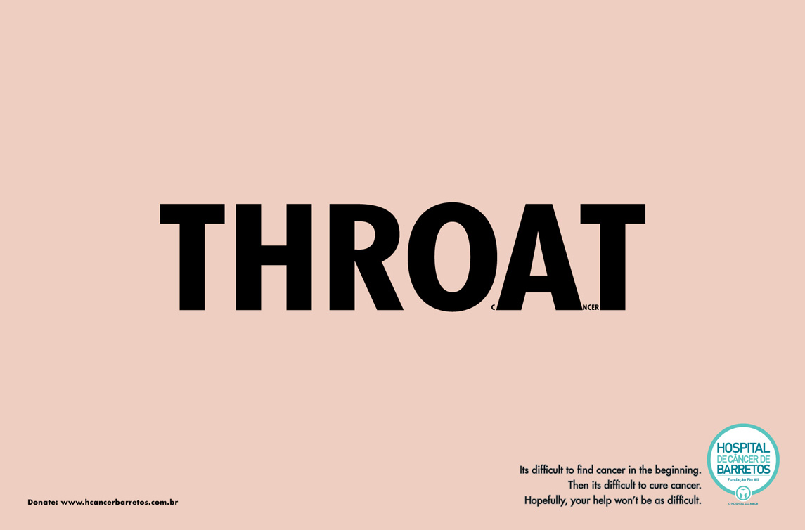 Найди слово "рак"На первый взгляд принты, сделанные агентством MatosGrey, никак не связаны с раком. Но, если присмотреться, в каждом из этих слов присутствует название болезни.Надпись: "Диагностировать рак тяжело. Без нашей помощи это действительно тяжело. Без вашей помощи - невозможно" Состав творческой группы Рекламное агентство: MatosGrey, S?o Paulo, Brazil Творческие директора: Silvio Matos, Leandro Castilho Арт директор: Guto Kono Копирайтер: Fabio Le?o |