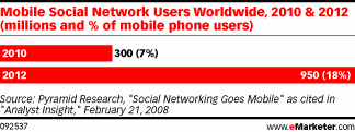 По всему миру растет число людей, общающихся в социальных сетях посредством мобильных телефонов С 2010 по 2012 их количество вырастет втрое, - прогнозируют авторы доклада «Social Networking Goes Mobile» («Социальные сети становятся мобильными»), выпущенного Pyramid Research (а него ссылается eMarketer).