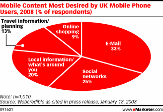 В частности, в Великобритании спрос на мобильный доступ в социальные Сети особенно велик . По данным исследования Webcredible, проведенного в январе 2008 года, такими сервисами хотят пользоваться четверть пользователей мобильной связи в Соединенном королевстве. Социальные сети стали вторыми в рейтинге мобильных сервисов среди британской аудитории - их опередила только мобильная электронная почта.