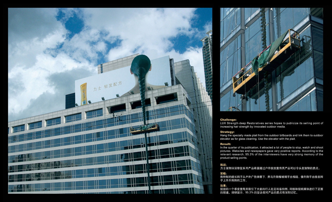 Lux: крепкие волосы способны на всеКаждая женщина мечтает о красивых, сильных и наполненных жизненной энергией волосах, Lux осуществляет эти мечты. Для привлечения внимания ЦА, агентство из Китая JWT поместило на крышу здания билборд с изображением женщины, волосы которой заплетены в косу. Она спускается до самой земли и при этом держит людей люльку с рабочим персоналом, который моет окна.Состав творческой группы Рекламное агентство: JWT, Beijing, China Творческий директор: Jordan Hsueh, Sun ShanKun Арт директор: Chris Yan Копирайтер: Wang Su |