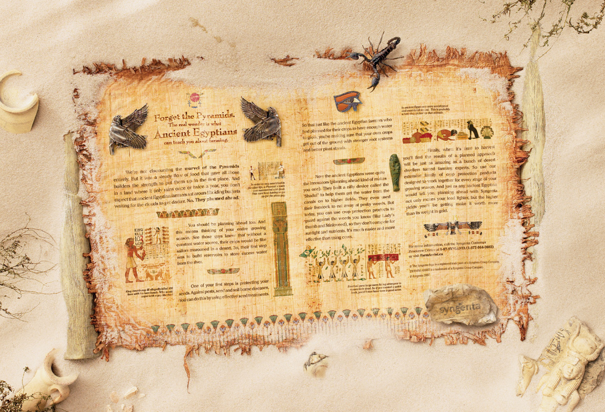 Знания из глубин веков. Египтяне учат сельскому хозяйствуКанадское агентство Bos считает, что настоящее чудо - это не сами пирамиды, а то, как древние занимались сельским хозяйством. Благодаря компании Syngenta, которая специализируется на средствах защиты растений и высококачественных семенах, успех вашему агробизнесу обеспечен.Надпись: "Забудьте пирамиды. Настоящее чудо заключается в том, что древние египтяне могут научить вас заниматься сельским хозяйством " Агентство: Bos, Toronto, Canada Творческий директор: Gary Watson Художник: Ibraheem Youssef Иллюстратор: George Azmy Фотограф: Frank Hoedl Копирайтер: Mwewa Frederick Nduna |