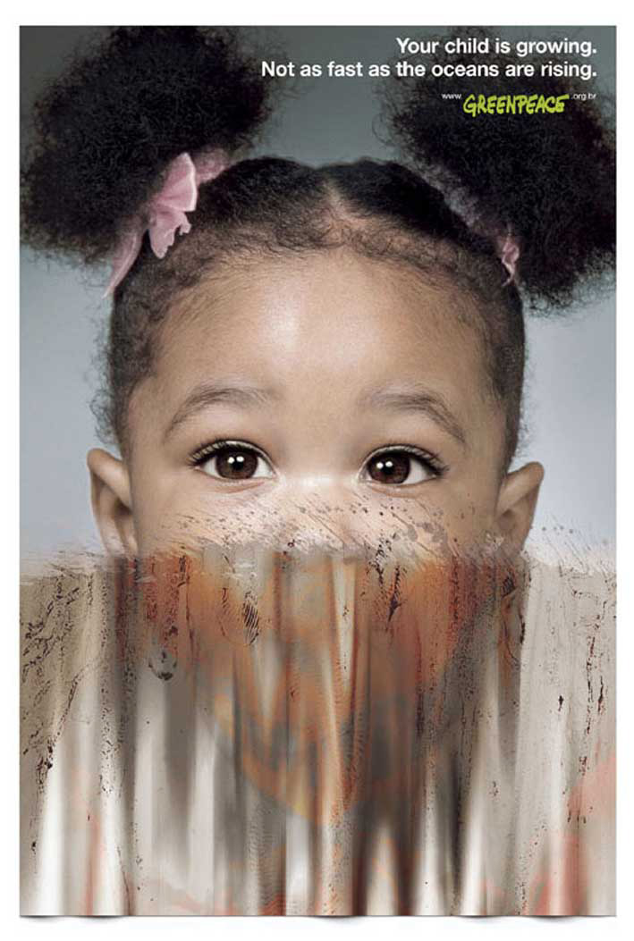 Greenpeace: спасение детей - дело рук взрослыхПарниковый эффект и глобальное потепление вызывают таянье льдов, и как следствие, повышение уровня мирового океана. Для привлечения внимания общественности к данной проблеме Greenpeace показывается нам изображения детей, лица которых "растеклись".Надпись: "Ваш ребенок растет. Не так быстро, как поднимается уровень океана" Агентство: Almap BBDO, Seo Paulo, Brazil Творческий директор: Marcello Serpa, Roberto Pereira, Luiz Sanches Художник: Bruno Prosperi, Marcos Medeiros Копирайтер: Renato Sim?es |