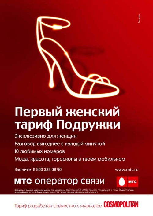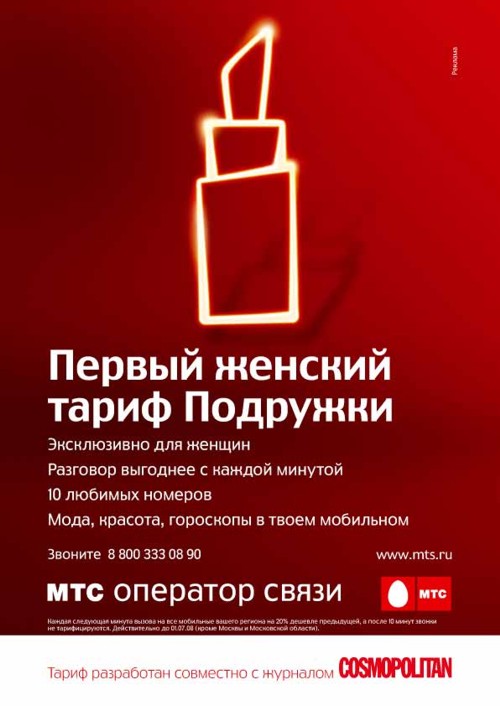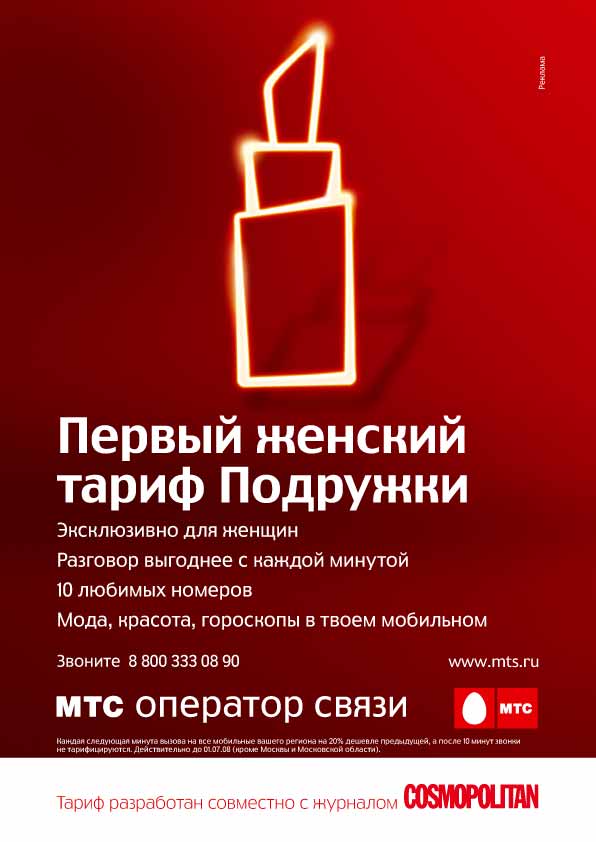 Туфли и помада - понятнее яиц. Наружная реклама МТСВ продолжение представленной ранее коммуникации МТС, нашедшей свое воплощение в рекламном ролике агентства Saatchi&Saatchi Belarus, на улицах Москвы появилась наружная реклама тарифного плана "Подружки", разработанная агентством JWT International.На макетах вместо привычных "яиц" присутствуют понятные каждой женщине образы: помада и туфли. Трансляция рекламного ролика должна завершиться в марте. Для "Подружек" был создан "Женский портал" wap.podrugi.mts.ru, который предлагает комплекс дополнительных мобильных услуг. Вниманию пользователей были представлены странички с информацией, подобранной журналом Cosmopolitan специально для женской аудитории: "Мой день" - гороскопы, музыка, светская хроника; "Эксклюзивно от Cosmopolitan" - статьи, диеты, счетчик калорий, гид по шоппингу; "Социальная сеть "Подружки" - профайлы пользователей, блоги, чаты, знакомства; "Бутик" - каталог музыки, звуков, видео, игр, картинок и анимации; "Стиль жизни" - модные тенденции, здоровое питание; "Гид" - магазины, фитнес-клубы, салоны красоты; "Любовь" - психологические тесты, советы, признания в любви. |