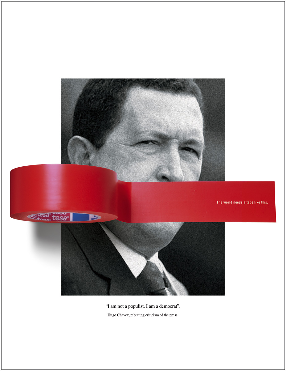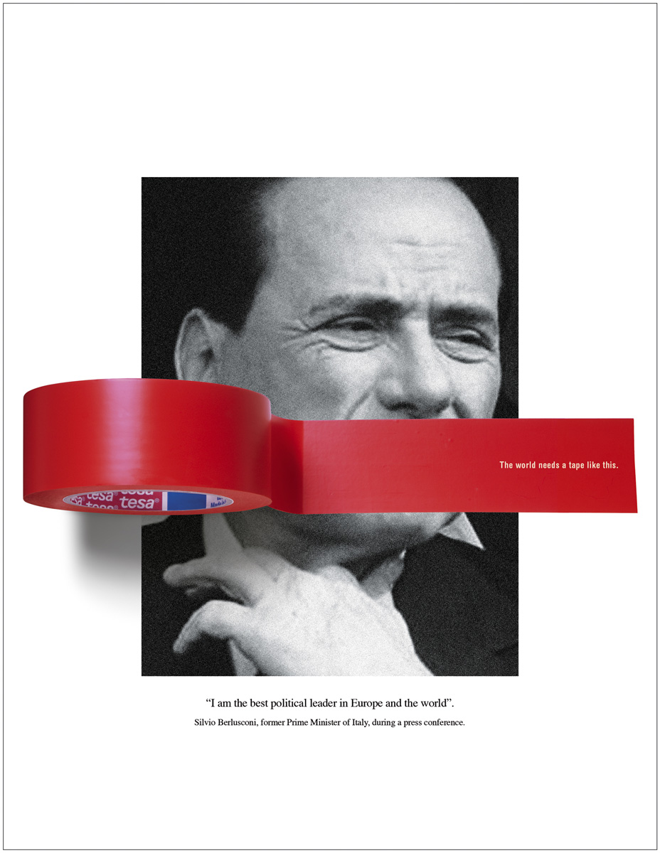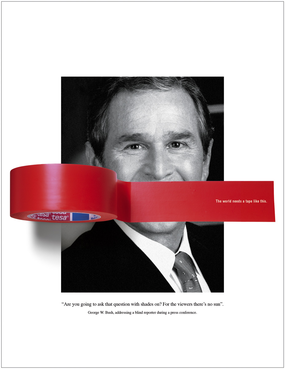 Tesa велела президентам заткнуться"Иногда, миру необходима лента наподобие этой", - заявляет Heads Propaganda при помощи рекламных плакатов для компании Tesa, специализирующейся на производстве самоклеящихся лент широкого спектра применения.Надписи: "Я не популист. Я демократ", - Уго Чавез противостоит критике со стороны прессы. "Я лучший политик в Европе и во всем мире", - Сильвио Берлускони, бывший премьер-министр Италии. "Вы будете задавать свой вопрос в очках? Тут нет солнца", - Джордж Буш обращается к слепому корреспонденту во время пресс-конференции. Агентство: Heads Propaganda, Curitiba, Brazil Креативный директор: Kike Borell Художник: Paulo de Almeida Копирайтеры: Gustavo Frare, Isis Ribeiro Фотограф: Nuno Papp |