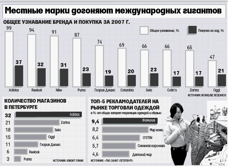 Производители одежды "избегают" прямой рекламыЛидеры рынка одежды по узнаваемости и количеству покупок являются аутсайдерами на рекламном рынке. По данным «TNS Санкт-Петербург», как пишут «Ведомости», на «Глорию джинс» и Sela приходилось соответственно по 0,3% и 0,1% всех расходов ритейлеров одежды и обуви на рекламу в петербургских медиа за прошлый год. Adidas потратила и того меньше. «Для компаний, которые давно работают на рынке, потребность в больших объемах рекламы отпадает», - комментирует эту ситуацию Наталья Немчина, директор по маркетингу «Мэлон фэшн груп» (марки Zarina и Befree). Маргарита Васильева, генеральный директор агентства «Паприка брендинг» добавляет, что часто рекламой сетям служат вывески и витрины их магазинов. «Для раскрученных сетей дистрибуция и представленность в торговых центрах важнее прямой рекламы. Кроме того, они часто стремятся выстроить у целевой аудитории свой оригинальный образ, проводя, например, BTL-акции», — полагает она. Согласно исследованию, проведенному WorkLine Research в феврале 2008 года на выборке из 650 петербуржцев, самые популярные марки одежды в Петербурге — международные брэнды спортивной одежды. Респондентов спрашивали, какие марки они готовы назвать навскидку (спонтанное знание), какие марки знакомы им из перечня брэндов (знание по списку) и одежду каких марок они покупали хотя бы раз за прошлый год ( см. таблицу ). Марку Adidas знают 99% горожан, а покупали ее одежду в прошлом году 37%. Не намного отстают от нее Reebok и Nike. А с другими международными гигантами отечественная одежда уже успешно конкурирует. По 23% петербуржцев покупали в прошлом году одежду под марками Puma и Sela, петербургскую марку Oggi — 21%, Columbia — 20%. В опросе были приведены также около 20 марок класса люкс, говорит директор по стратегическому развитию WorkLine Research Михаил Подушко. Но они показали очень низкие цифры по спонтанному знанию и по количеству покупок. Например, D&G cпонтанно назвали 5,5% петербуржцев, Calvin Klein — 3,6%, Armani — 3,3%. Одежду этих марок покупали в 2007 году меньше 1% петербуржцев. Причем практика, по которой российские франчайзи иностранных марок должны тратить $20 000-50 000 в сезон на местную рекламу, неэффективна, отмечает Никита Кондрушенко, генеральный директор компании «СПб фэшн». «Такая реклама не работает. У людей просто не остается в голове то, что им практически точно не пригодится», — рассуждает он.adlife.spb.ru |