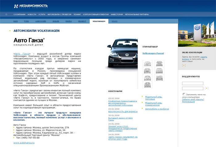 ADV разработало новый сайт ГК "Независимость"19 марта состоялось открытие нового Интернет-сайта группы компаний "Независимость" www.indep.ru , разработанного компанией ADV/web-engineering.Изюминкой проекта стала возможность быстрого и легкого выбора автомобиля прямо на сайте по параметрам, интересующим пользователя, а также возможность сделать онлайн-заказ, что значительно повышает комфорт и скорость совершения покупки, делая эту процедуру необременительной и приятной. На новом сайте ГК "Независимость" пользователи могут ознакомиться с многочисленными предложениями по подержанным автомобилям, с возможностью их удобного поиска, сравнения по параметрам и даже предварительного заказа. Для пользователей открыт доступ к расширенному списку услуг от таких традиционных как заказ тест-драйва, запись на сервис и управление новостной подпиской до более продвинутых, как оналайн-консультации специалистов и отслеживание в онлайн-режиме обработки сервисных заявок. Проект имеет англоязычную версию и простую в использовании навигационную линейку меню. Дизайн сайта подчеркивает основные ценности компании, предлагаемые клиенту - свободу и широту выбора. Пейзаж с маяком на главной странице сайта отражает ключевое положение компании на рынке, а также индивидуальных подход к каждому клиенту, возможность сориентироваться в море предложений на рынке. Сотрудничество ГК "Независимость" с ADV/web-engineering началось осенью 2007 года после победы ADV в тендере, организованном заказчиком. В ближайших планах - открытие ряда новых Интернет-проектов автомобильной тематики. |