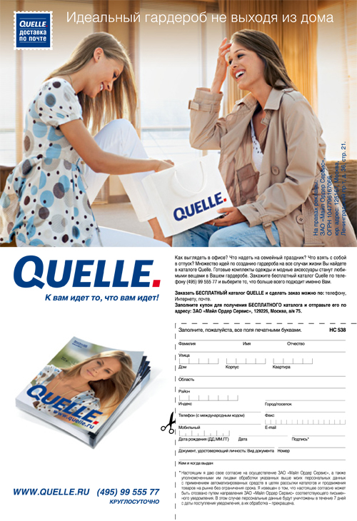 Домохозяйки вынесли себе модный приговор. McCann Erickson сделал ролик для каталога QUELLEВ марте 2008 года в эфире Первого, Россия, СТС, Домашнего каналов вышел первый ролик бренда QUELLE (ЗАО "Майл Ордер Сервис").Интегрированная стратегическая коммуникация разработана креативным агентством McCann Erickson на основе ряда количественно-качественных исследований рынка. Коммуникация задействует все актуальные каналы: ТВ, прессу, интернет, BTL и директ-маркетинг. Это первая в России стратегическая кампания в своей категории, целью которой является закрепление лидерства Quelle на рынке каталогов одежды. Стратегия медийного размещения разработана и осуществлена агентством Mediaedge CIA (GroupM). Состав творческой группы Хронометраж: 30 сек., 15 сек., 10 сек. (спонсорская заставка) Бренд: Quelle Клиент: ЗАО "Майл Ордер Сервис" Директор по маркетингу и продажам: Ирина Платонова Руководитель группы маркетинговых коммуникаций: Татьяна Чиркова Агентство: McCann Erickson Генеральный директор: Евгения Мур Директор по стратегическому планированию: Антон Молодцов Менеджер по стратегическому планированию: Наталья Бурчилина Арт-директор: Андрей Егоров Копирайтер: Светлана Помыткина Руководитель группы по работе с клиентами: Татьяна Немцова Менеджер по работе с клиентами: Оксана Кондратьева Продюсер агентства: Ксения Кузьмина Продакшн: Focus Film Генеральный Продюсер: Сергей Агеев Продюсер продакшн хауса: Сергей Агеев Режиссер: Seth Henrikcson Оператор: Евгений Ермоленко