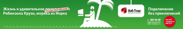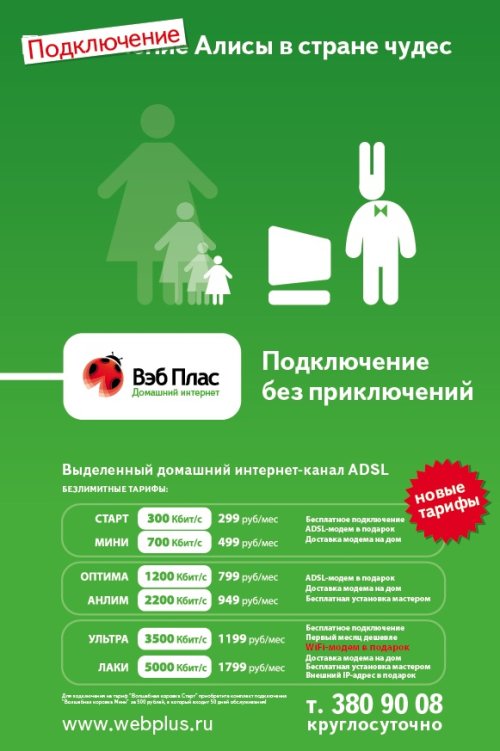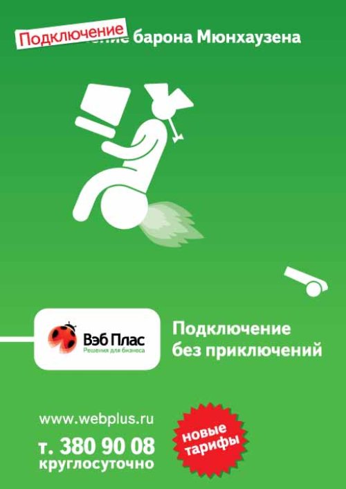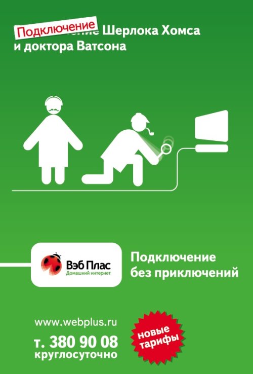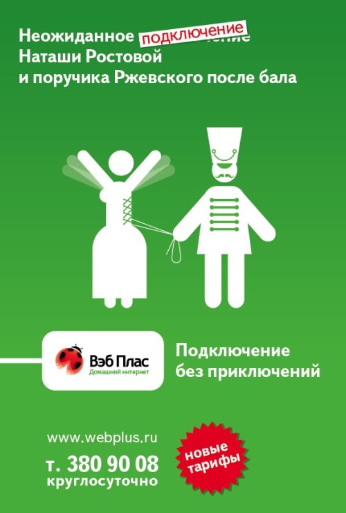 Подключение к «Вэб Плас» на дне стакана«Вэб Плас» запустил весеннюю рекламную кампанию под девизом «Подключение без приключений», запущенным ещё в 2007 году.Как рассказали Adlife.spb.ru в «Вэб Плас», теперь девиз демонстрируется через сюжеты известных книг. С помощью такого приема, как замена слова «приключения» на слово «подключение», показываются всем известные заголовки-названия книг или известные истории в новом, неожиданном ракурсе. Это привлекает внимание и вызывает улыбку. Картинка дополняет это сообщение. «А акцент именно на слове «подключение» отсылает к слогану и основной идее сообщения – рассказать и показать, что «Вэб Плас» это простое подключение, без проблем и «приключений», - прокомментировали в компании.