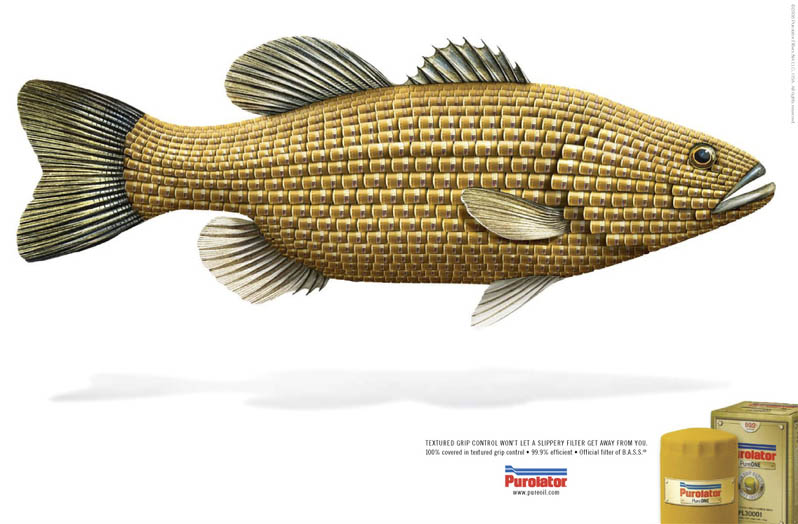 Рыба с масляными фильтрамиКомпания Purolator, которая занимается производством масляных фильтров, с помощью агентства The Buntin Group выпустила плакат с изображением рыбы, которая имеет одну интересную особенность. Вместо чешуи у нее фильтры: благодаря специальной текстурированной поверхности фильтров, они не выскочат у вас из рук как скользкая мокрая рыба.Агентство: The Buntin Group Клиент: Purolator Креативный директор: Tom Cocke Художник: Chris Just Иллюстратор: Mind's Eye |
