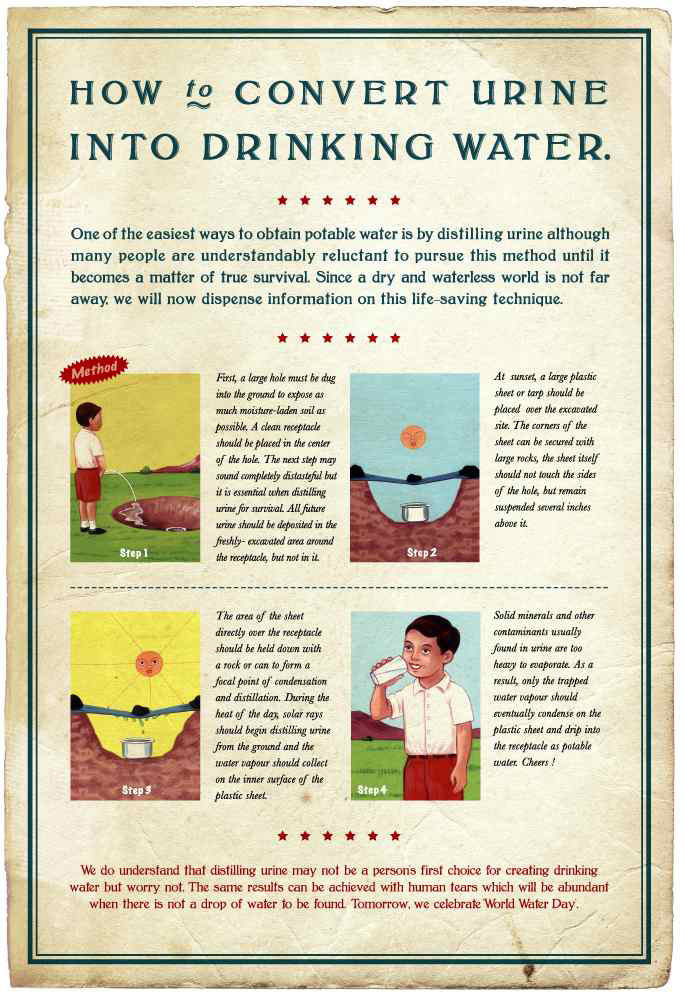 Всемирный день водыВода - это один из самых драгоценных ресурсов. И не стоит думать, что ее всегда будет в избытке. На случай, если вдруг случится такое, что вы останетесь без капли воды, индийское агентство Ogilvy & Mather рассказывает, как получить питьевую воду из мочи. Если вам не нравится этот способ, то точно также можно получить воду и из человеческих слез, которые польются рекой, когда нечего будет пить.Агентство: Ogilvy & Mather, Мумбай, Индия Главный творческий директор: Piyush Pandey, Abhijit Avasthi Творческий директор: Shekhar Jha, Mahesh Gharat Арт директор: Mahesh Gharat, Anad Rane Типограф: Mahesh Gharat () Иллюстратор: arab Копирайтер: Shekhar Jha |