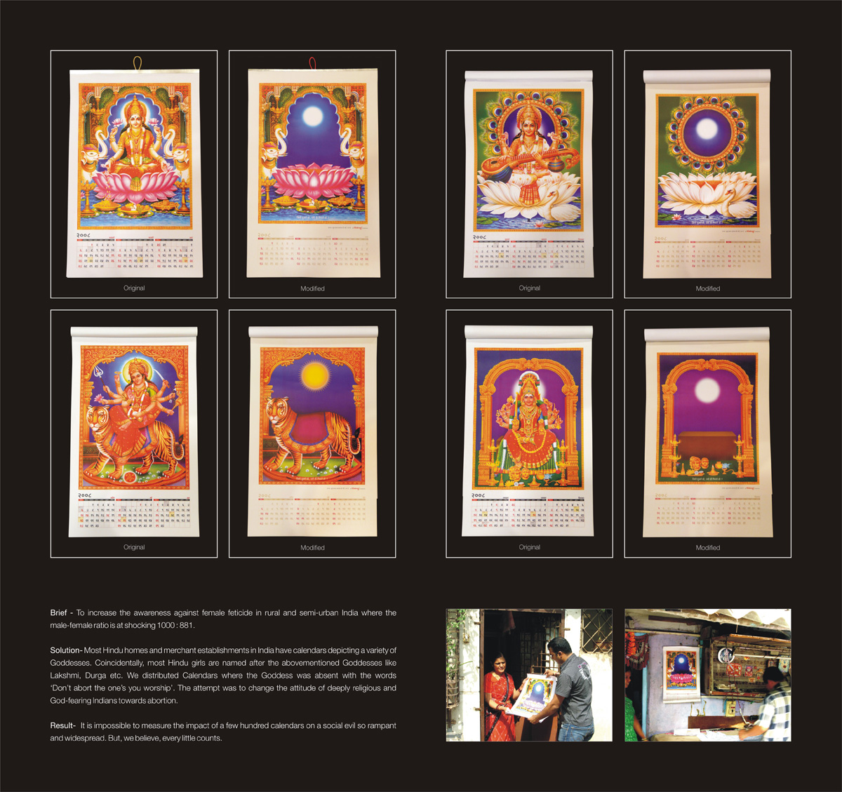 Индийские божества призывают женщин не делать абортыЦелью рекламной кампании от агентства DY&R является предостеречь индийских женщин от абортов. Для этого был выпущен календарь, разворот которого, учитывая социальную и религиозную специфику региона, украшали божества, призывающие не делать абортов.Агентство: Rediffusion DY&R, Mumbai, India Арт директор: Amol Dahanukar Копирайтер: Pranav Harihar Sharma |